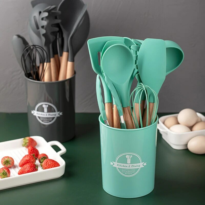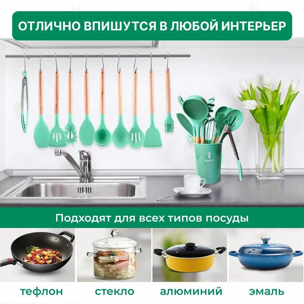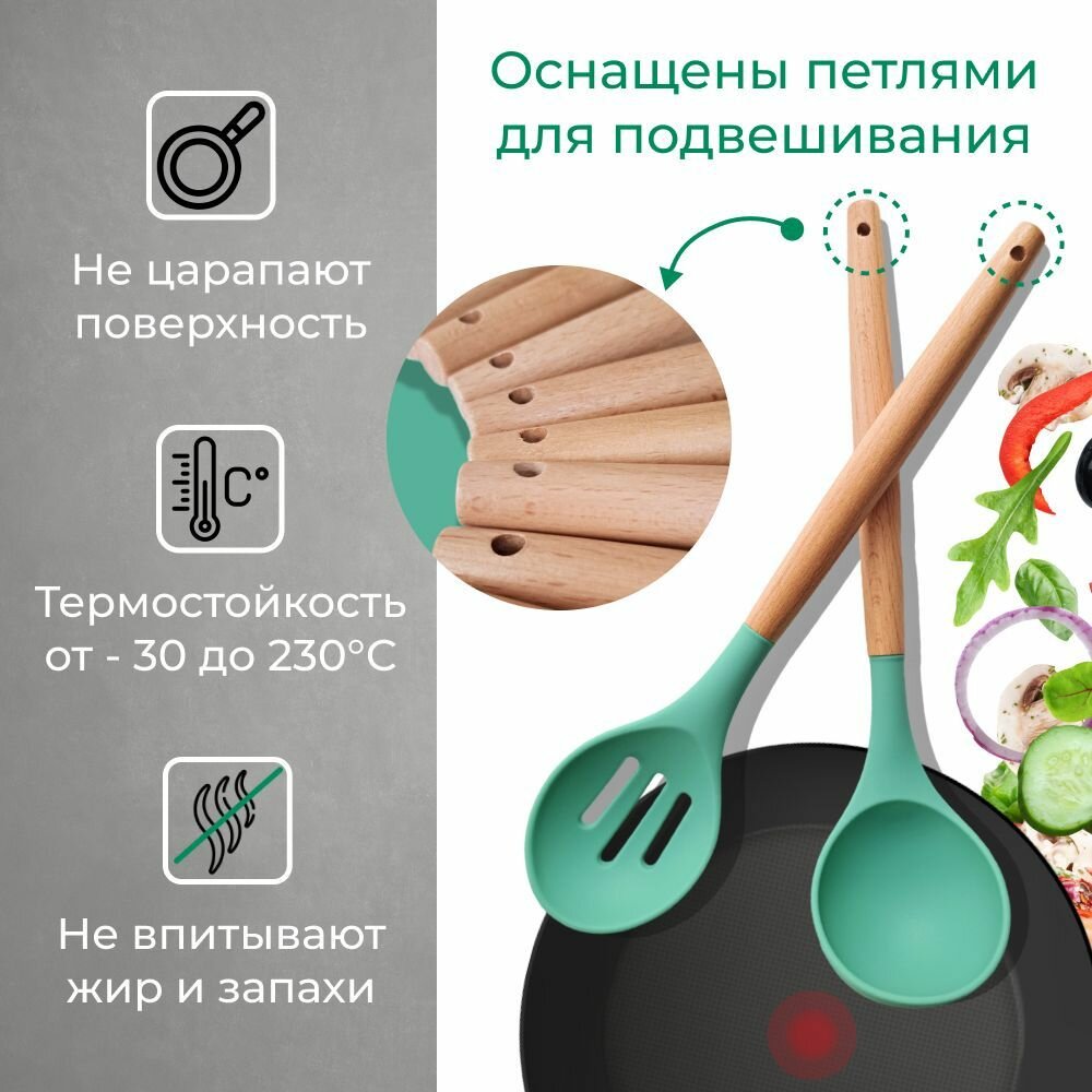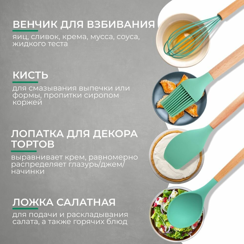Кухонный набор Kitchen Set силикон и бамбук из 12 шт / цвет мятный.