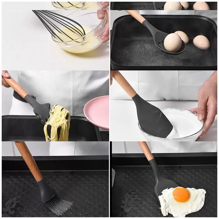 Кухонный набор Kitchen Set силикон и бамбук из 12 шт / цвет темно серый.