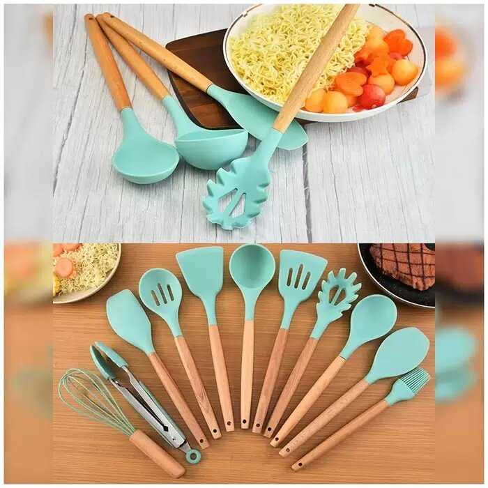 Купить Кухонный набор Kitchen Set силикон и бамбук из 12 шт / бирюзовый цвет.