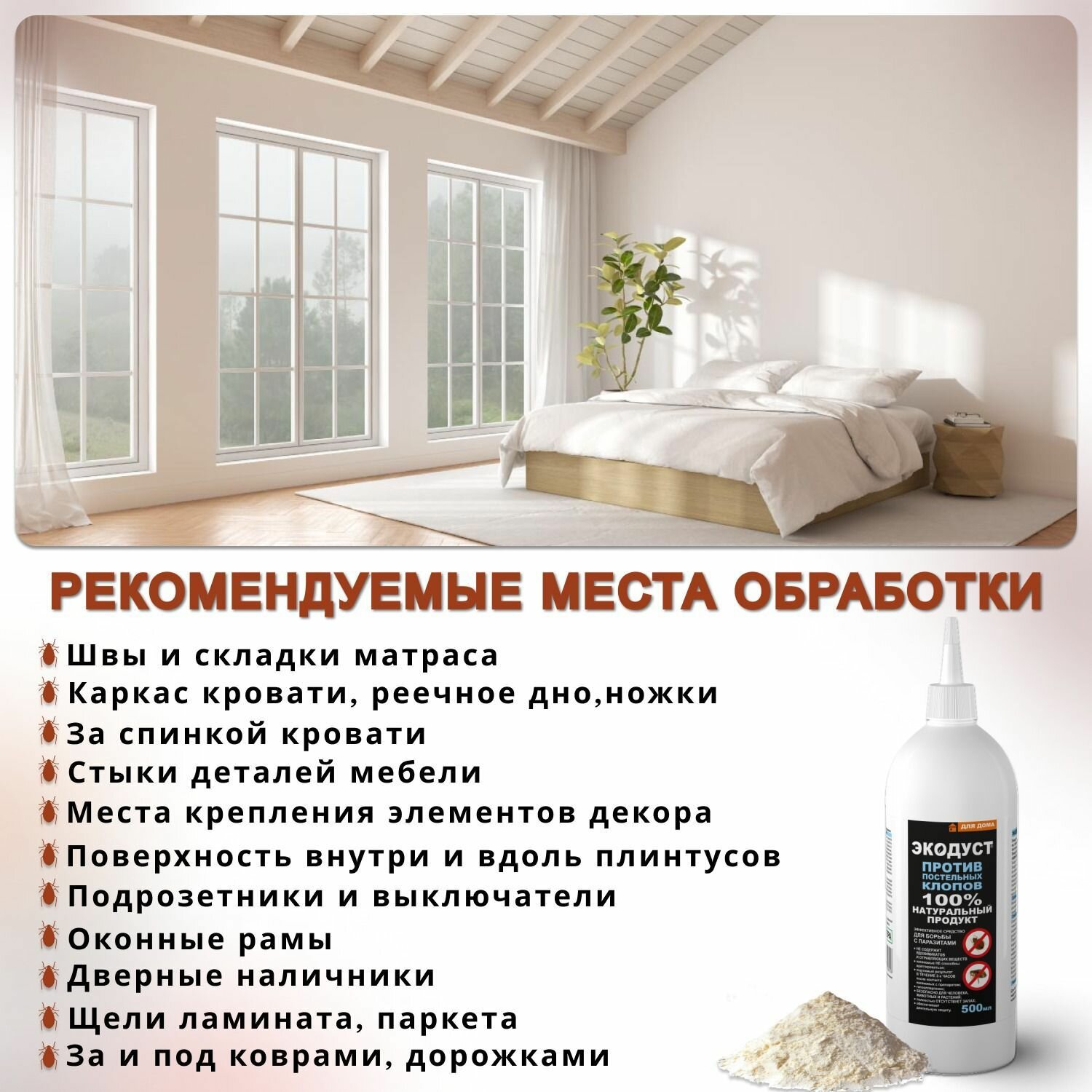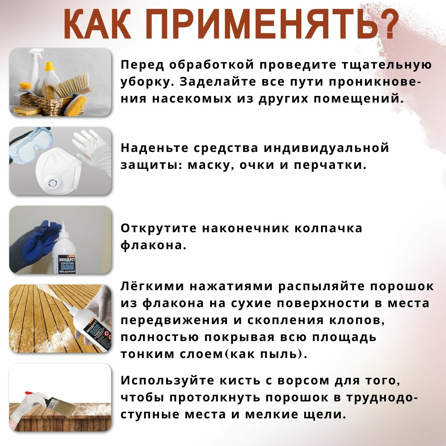 | Способ применения | снимите колпачок с носика крышки, не сильным нажатием распылите препарат во всех местах возможного скопления и перемещения клопов (матрас, между матрасом и конструкцией кровати, в скрытых полостях), порошок можно рассыпать вокруг ножек кровати, под ковром, опылить им задние стенки мебели, полки с книгами, ковровые покрытия, места вдоль плинтусов и под мебелью – то есть потенциальные места укрытий (зачастую здесь находятся гнезда клопов) и пути перемещения паразитов, все обрабатываемые поверхности должны быть сухими; через 3-4 часа пропылесосить места, обработанные Экодустом; уборка порошка из труднодоступных мест не обязательна; для полного избавления от паразитов процедуру надо повторить через 10 дней, чтобы воздействовать на все стадии жизненного цикла насекомых |