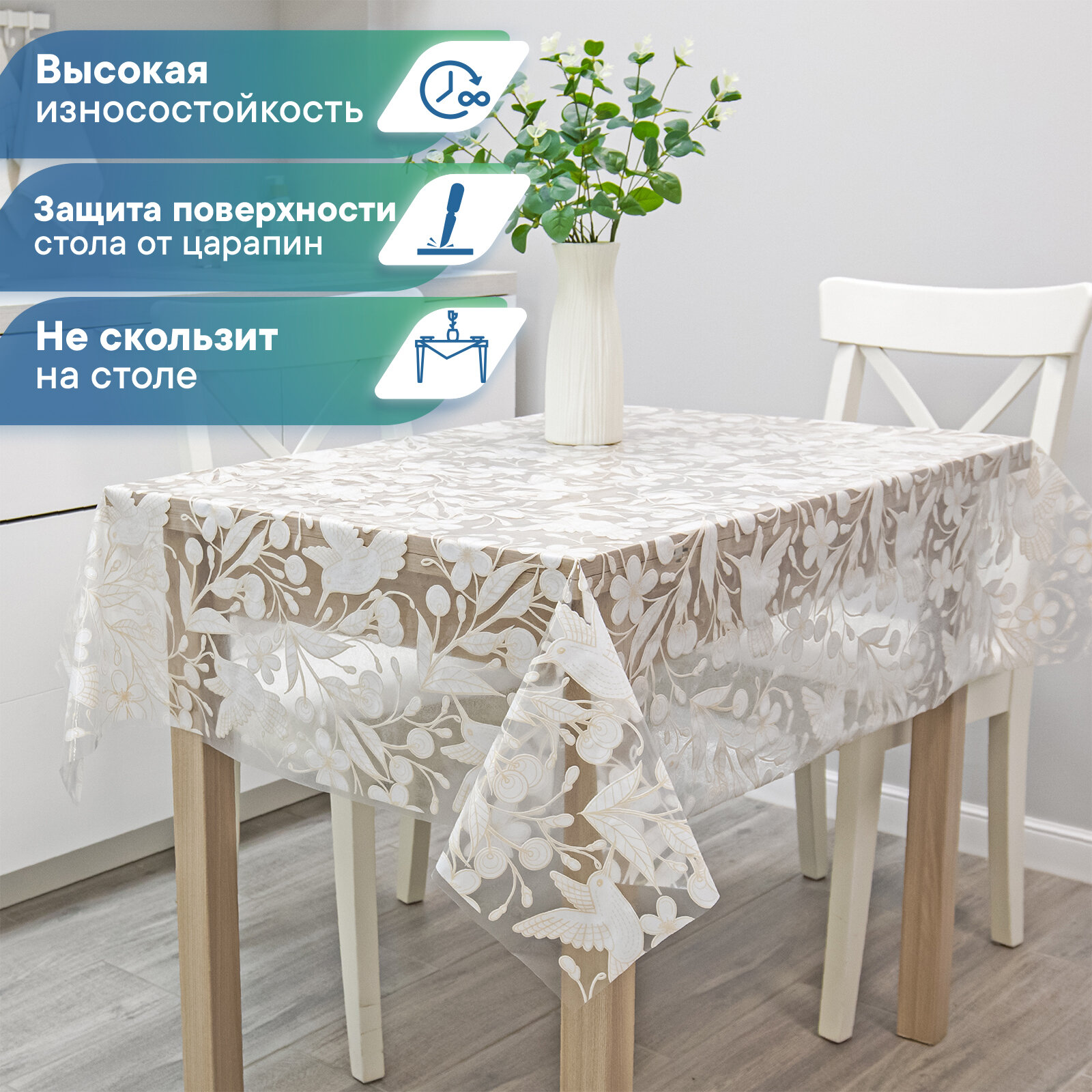 Скатерть клеенка на стол VILINA "Муза" ПВХ прямоугольная водонепроницаемая 132х180 см белая , серая колибри птицы