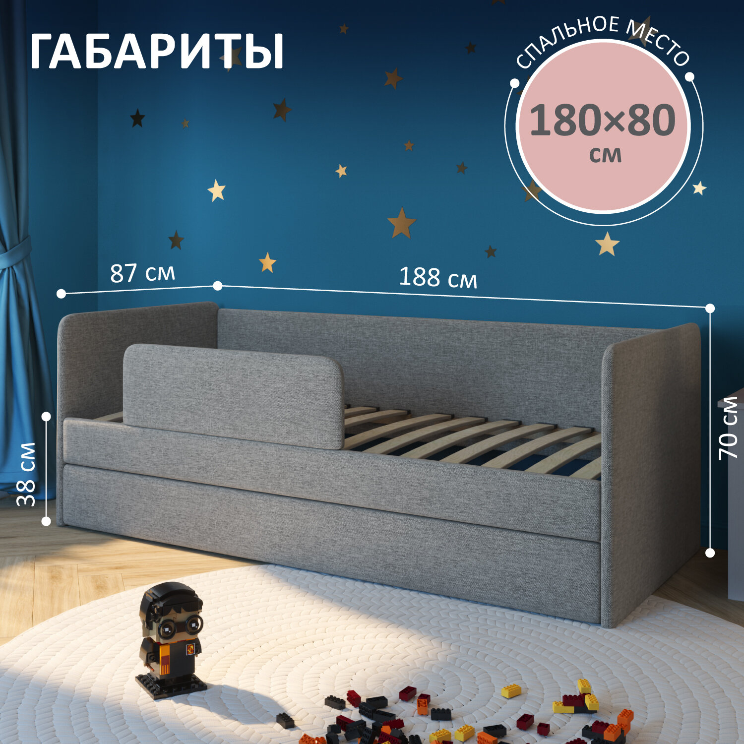 СохранитьКровать детская 180х80 Romack Jenny с бортиком и ящиком, с мягким изголовьем, Серая рогожка интересное: