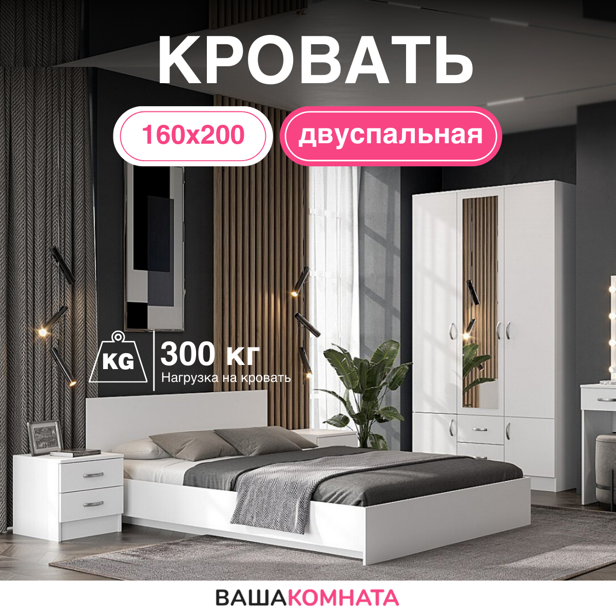 1 шт мс для спальни Ронда КР-160 (без основания) белое дерево/белое дерево + 1 шт мс для спальни Ронда основание КР-160 ЛДСП белый (Интерьер-Центр)