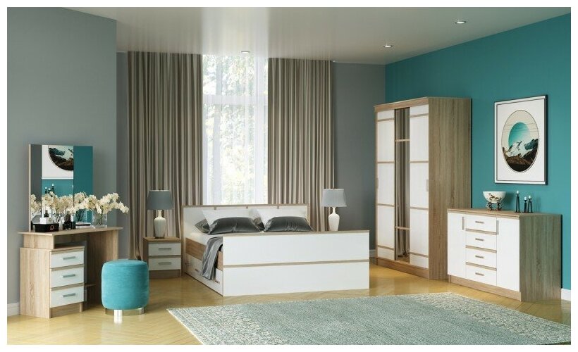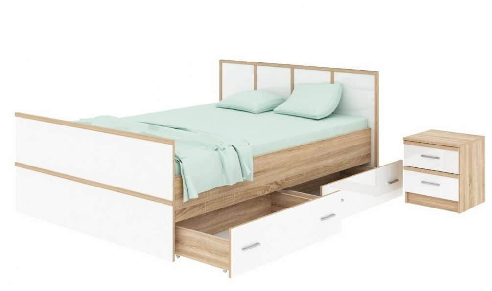Кровать с ящиками 1800 с двумя тумбочками Камелия, цвет дуб сонома, ШхГхВ 296х217х78,2 см, спальное место 1800х2000 мм, без матраса, основание есть
