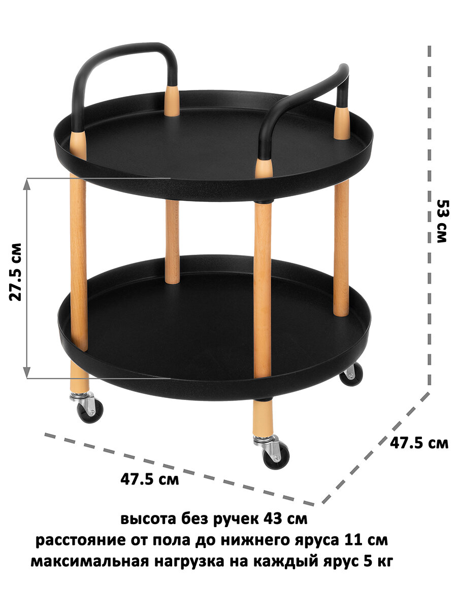 | Дополнительная информация | Этажерка-столик 2-х ярусный сервировочный "Черная" 47,5х47,5х53 см, на 4-х колесиках, 2 колесика с фиксаторами, высота без ручек 43 см, размер каждого яруса 47,5х47,5х3,5 см, расстояние от пола до нижнего яруса 11 см, расстояние между ярусами 27,5 см, максимальная нагрузка на каждый ярус 5 кг |