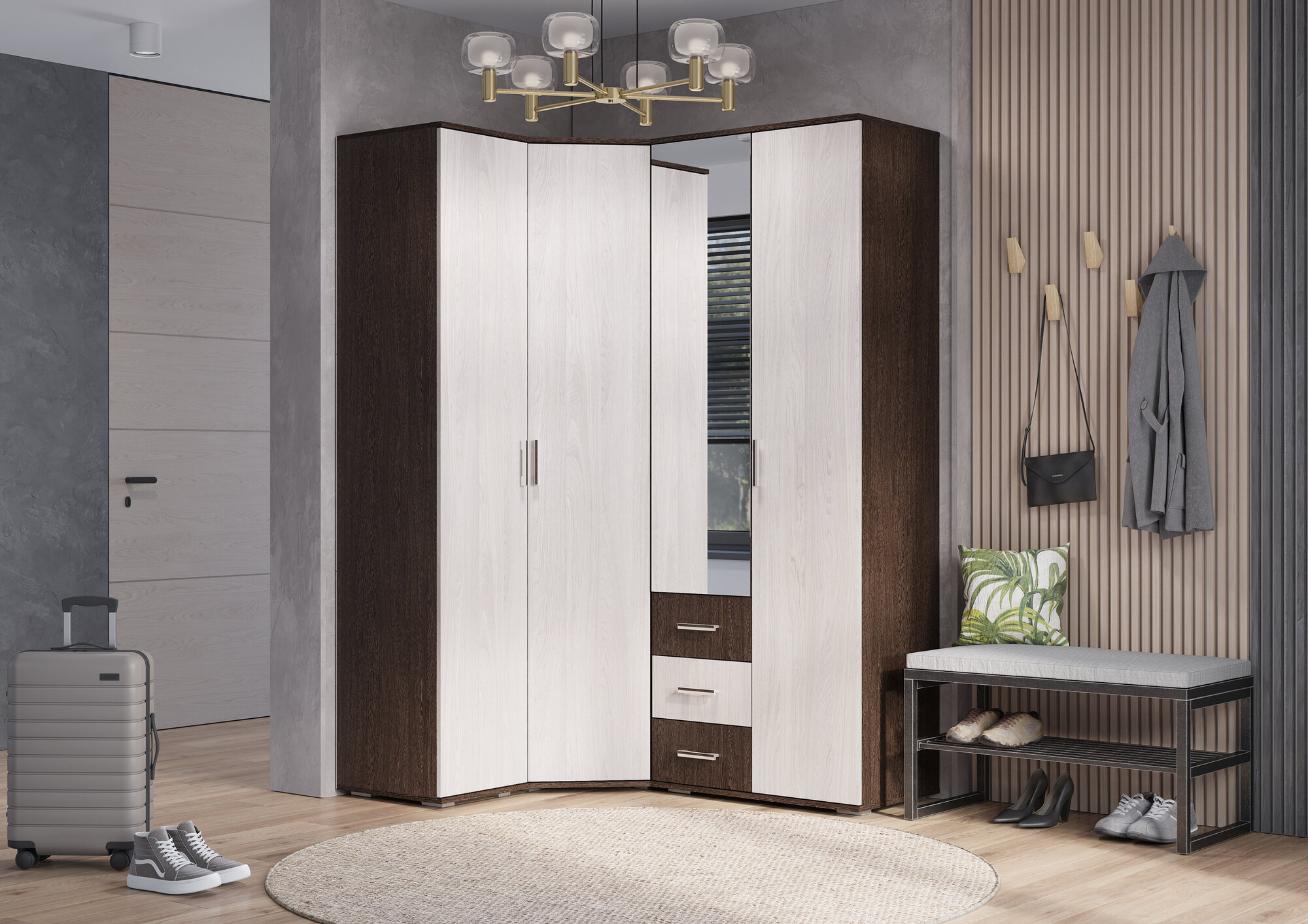 | Особенности | дверь со стеклом, модульный, с зеркалом, угловая конструкция, штанга для вешалок |
