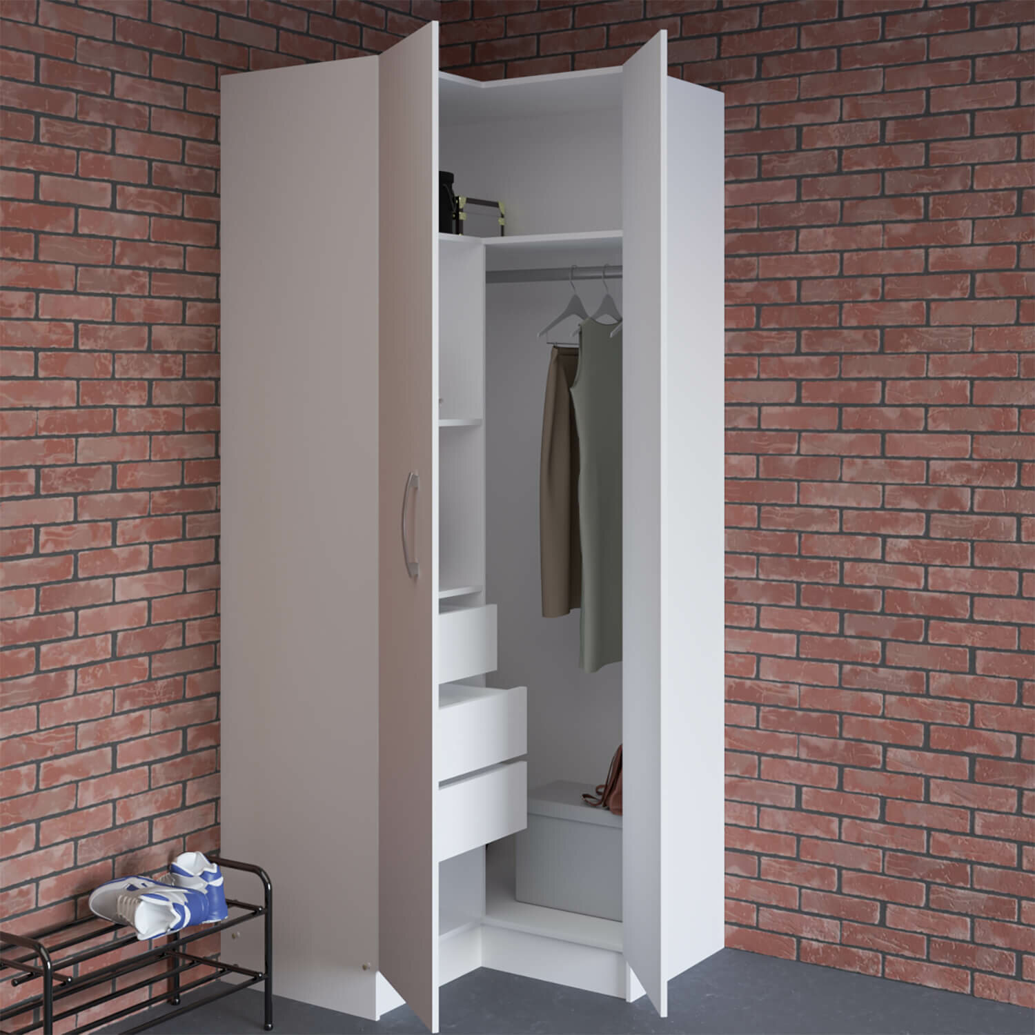 Шкаф угловой Боровичи-мебель 8.18, ЛДСП, 3 ящика, горизонтальная штанга, Белый 76253 интересное: