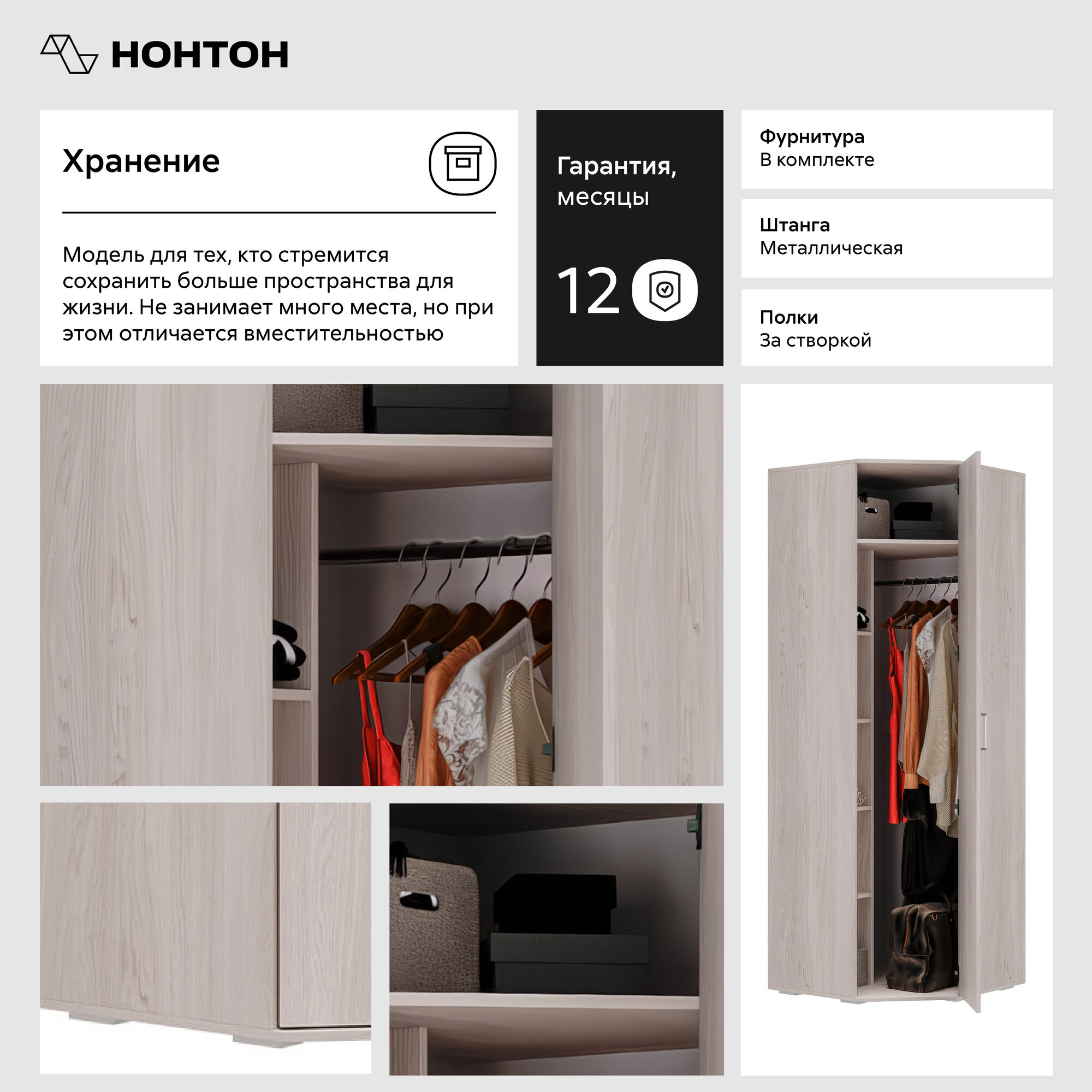 | Дополнительная информация | Комплектация пенала включает в себя 4 полки для одежды и хромированную штангу. |