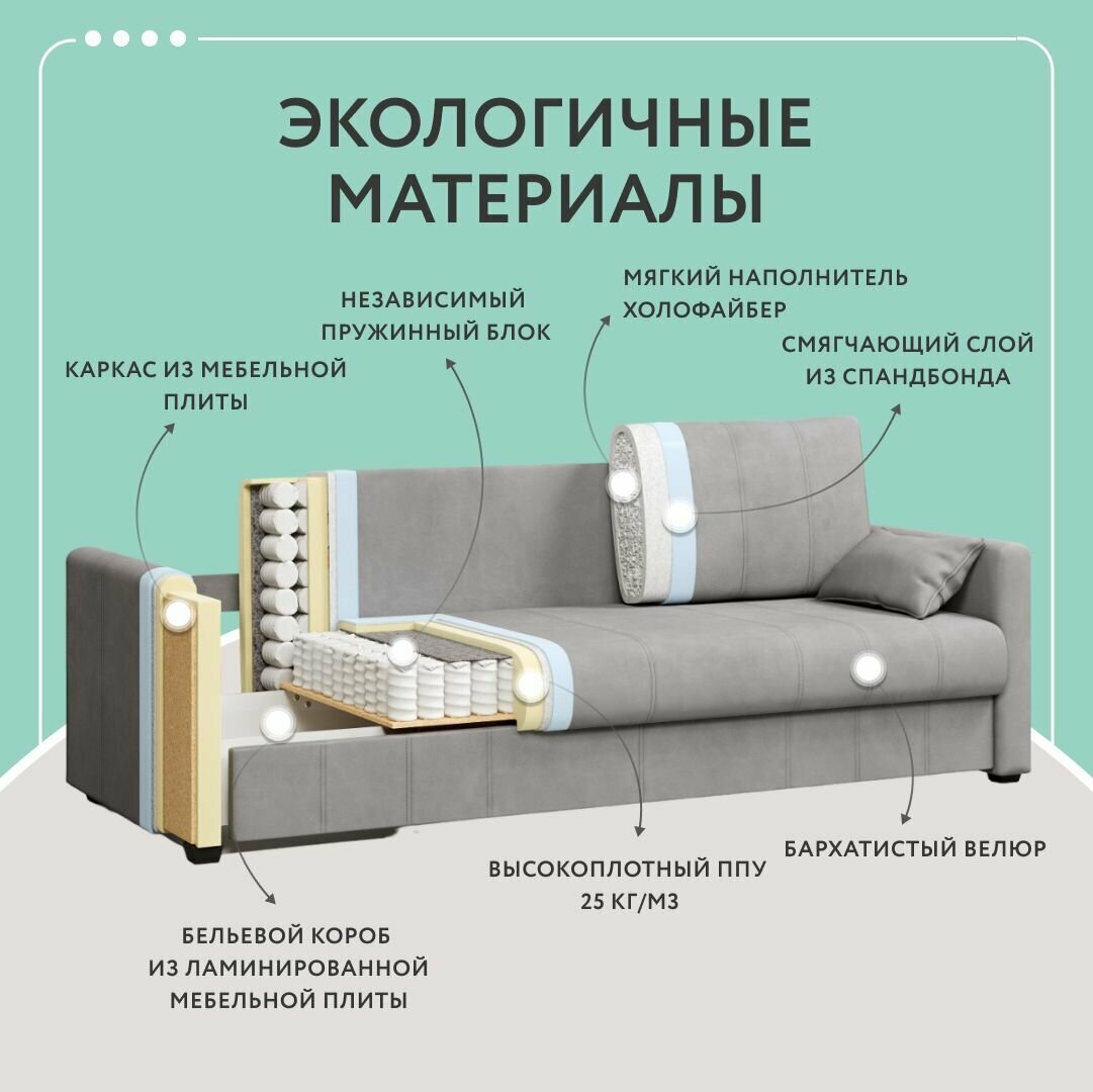 Диван-кровать раскладной прямой Римини, еврокнижка, велюр, серый, 221х98х90