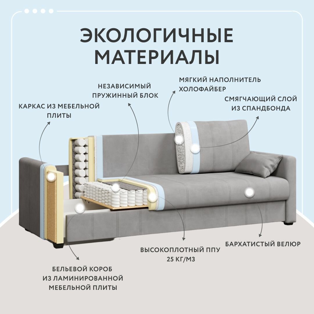 Диван-кровать раскладной прямой Римини, еврокнижка, велюр, серый, 221х98х90