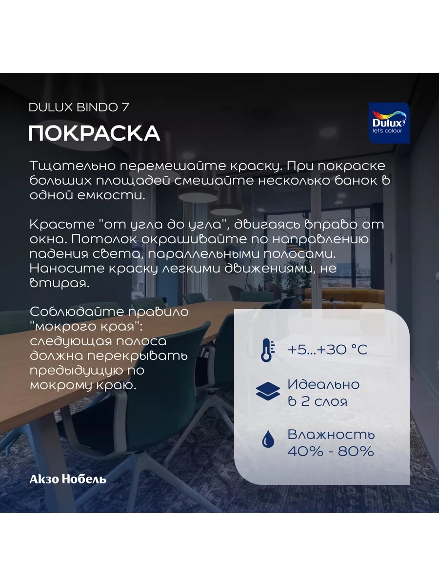 матовая моющаяся интерьерная краска Dulux BINDO 7, 4.5л, белая BW