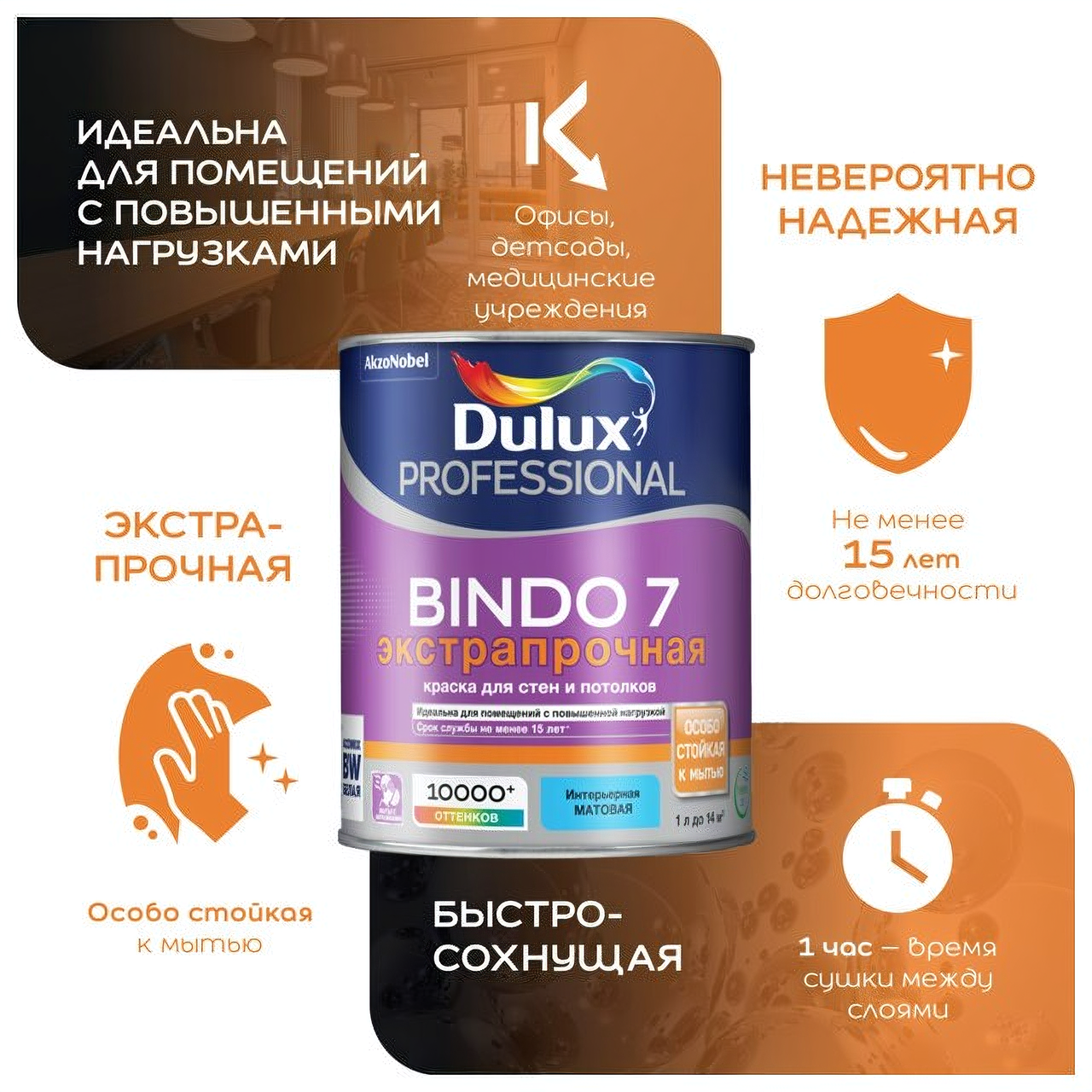 Краска DULUX BINDO 7 экстрапрочная для стен и потолков, матовая, бесцветная, База BC 2,25