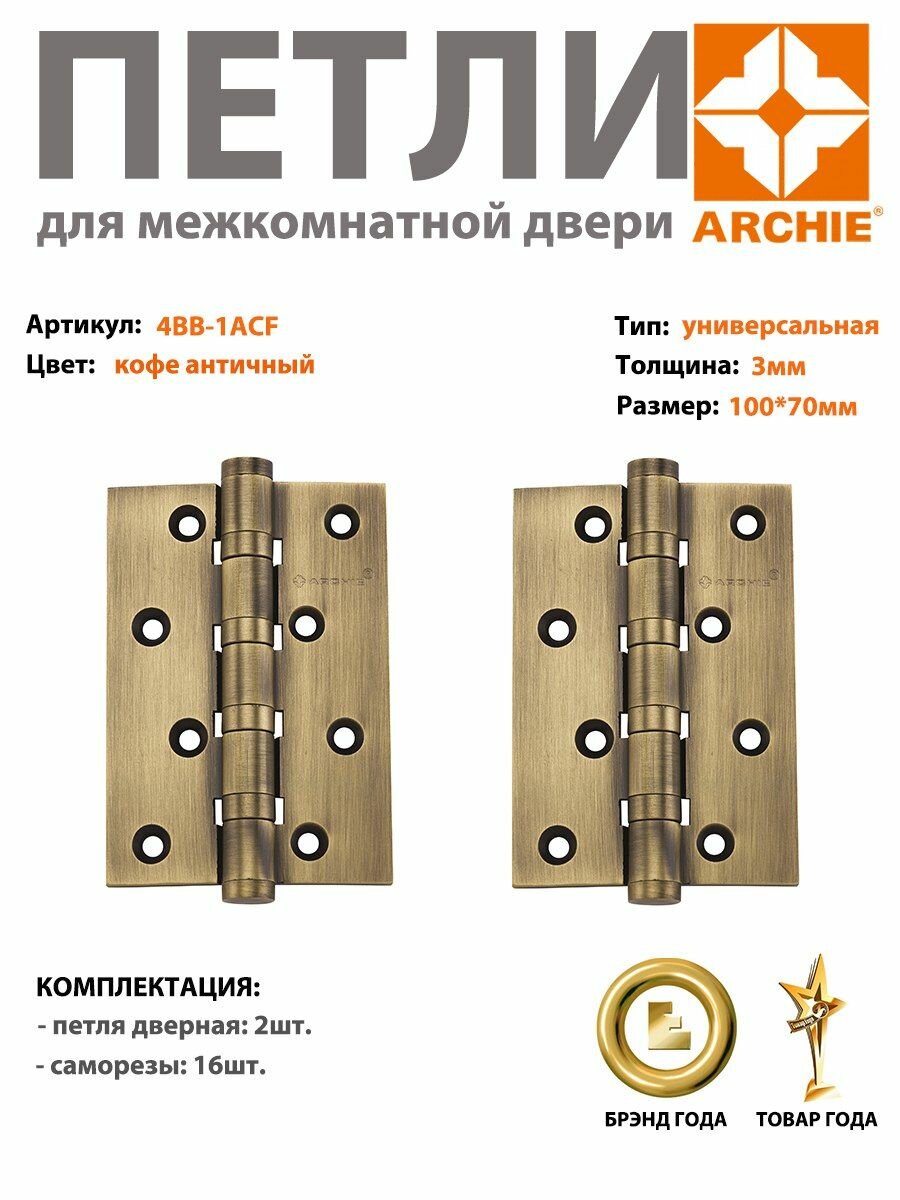 Петля дверная универсальная, 4 подшипника, латунь Archie A010-C 100X70X3-4BB-1ACF (комплект 2 штуки)