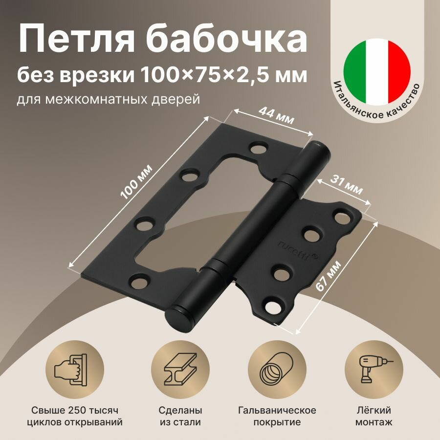 Петли дверные бабочки - Дверные петли без врезки Rucetti (Ручетти) RFH-100*75*2,5 BL Цвет - Черный (2 шт.)