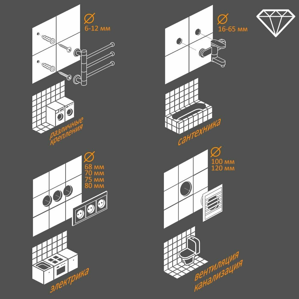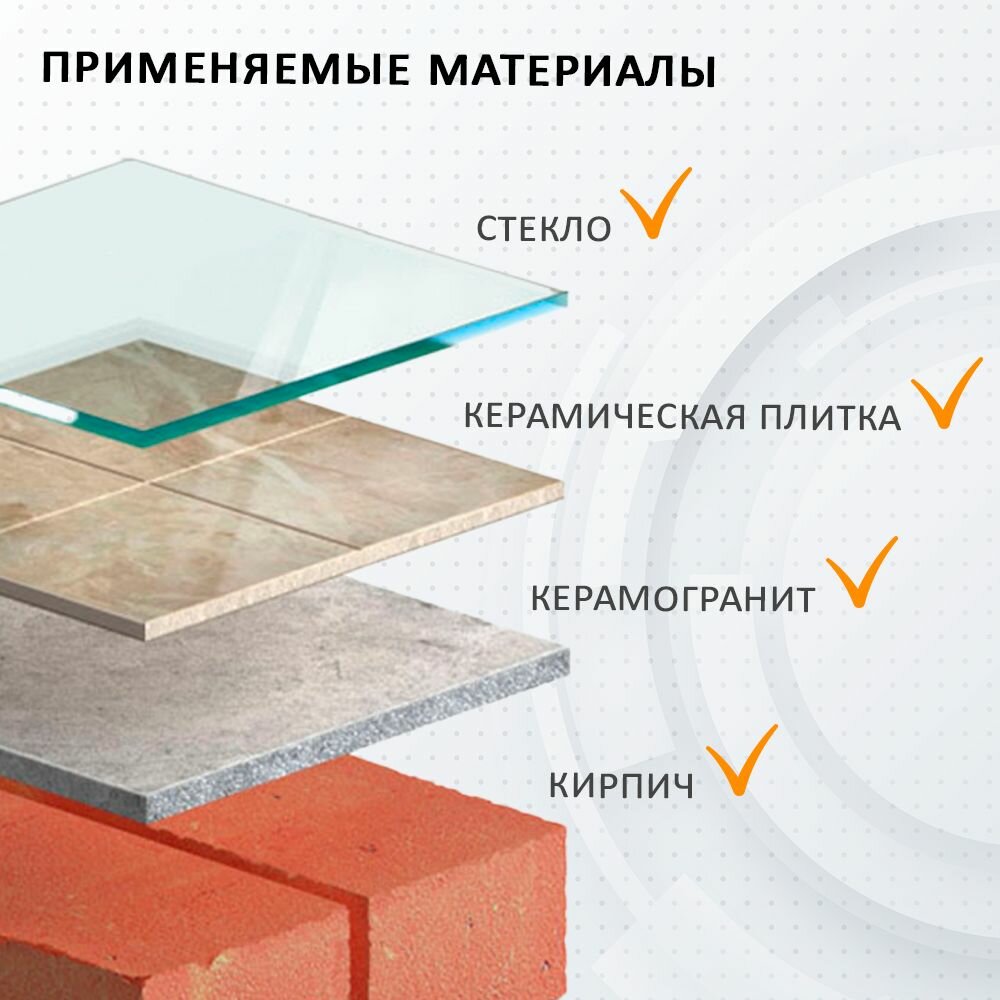 | Материал обработки | армированный бетон / бетон / гипсокартон / гранит / железобетон / камень / керамика / керамогранит / кирпич / мрамор / мягкий кирпич / стекло |