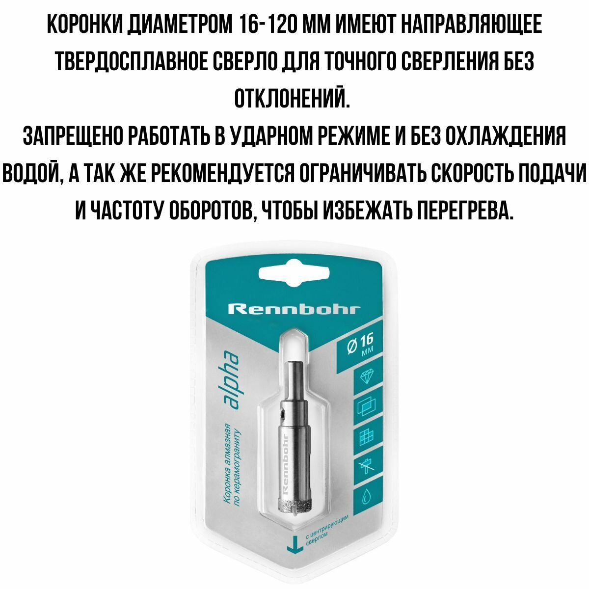 | Дополнительная информация | Коронка алмазная RENNBOHR 25мм с центрирующим сверлом |