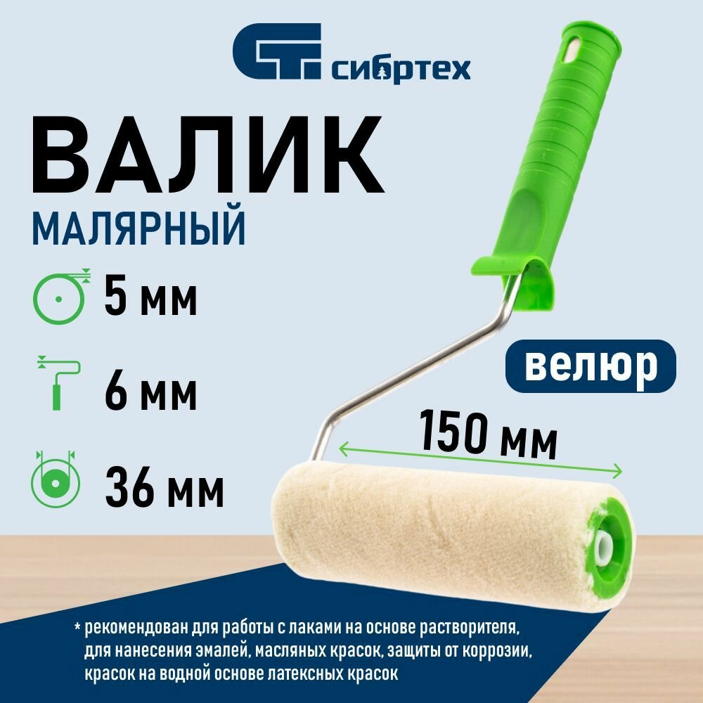 Валик малярный Сибртех 150 мм, D 36 мм, с ручкой 6 мм, полиакрил, шерсть велюр (80133)