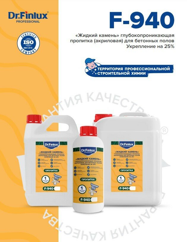 Ниже Вы можете прочитать отзывы на Укрепляющая и обеспыливающая водоотталкивающая пропитка для бетона, бетонного пола Dr. Finlux F-940 "Жидкий камень", 50 кв. м, 10 кг, ознакомится с подробными характеристиками, посмотреть интересные обзоры и фотографии на Укрепляющая и обеспыливающая водоотталкивающая пропитка для бетона, бетонного пола Dr. Finlux F-940 "Жидкий камень", 50 кв. м, 10 кг.