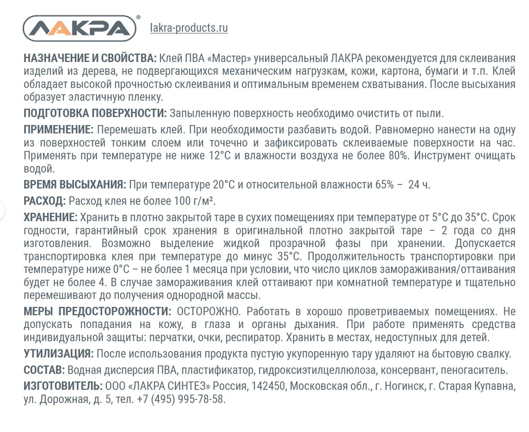 Лакра Клей ПВА мебельный Люкс 0,9кг 90002427712