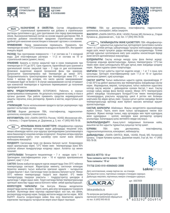 Купить Состав на основе ПВА Лакра "Модификатор" строительный (канистра) 10кг Л-С