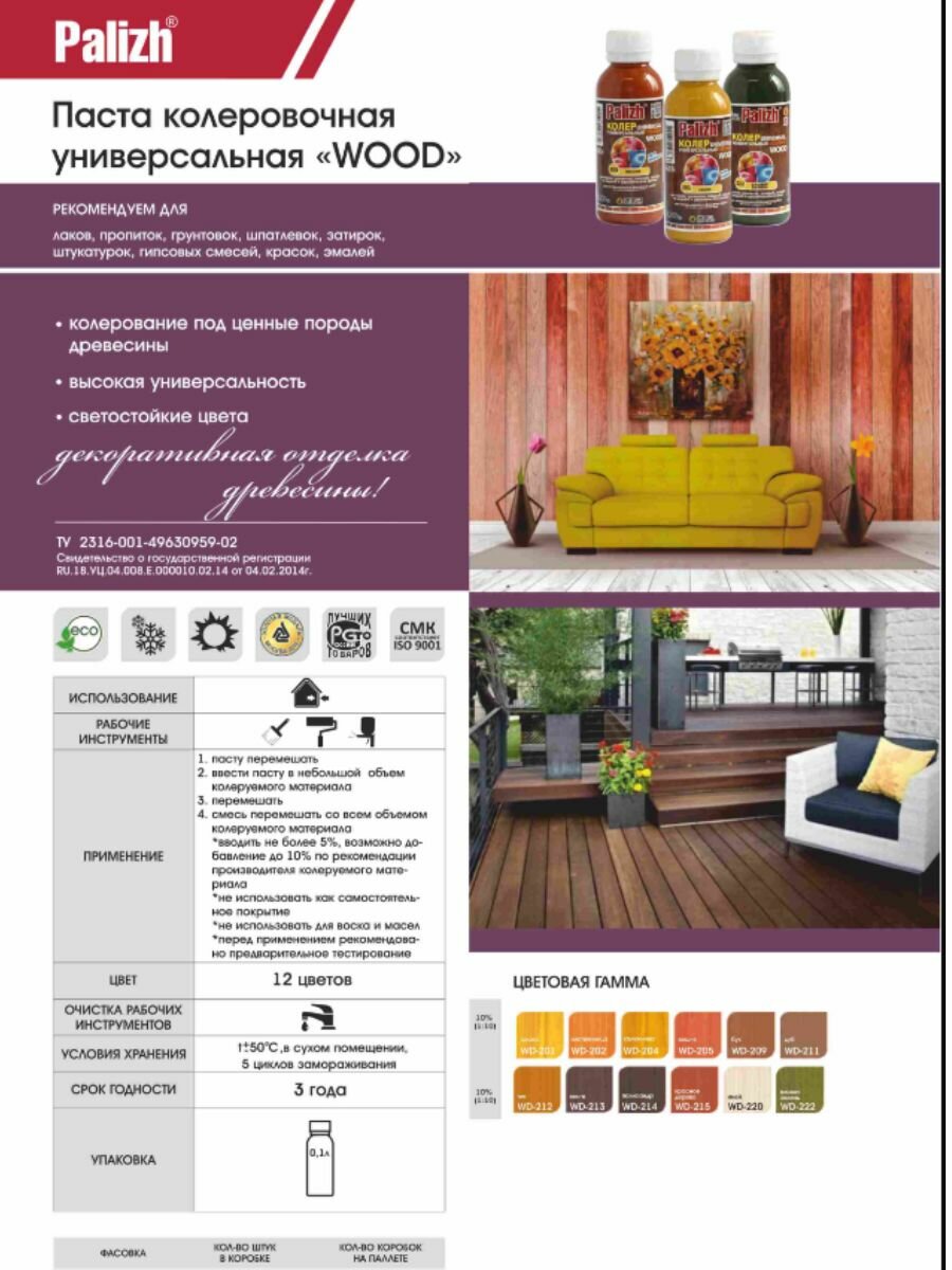 Паста колеровочная универсальная "Palizh WOOD" 0,1л №214 палисандр