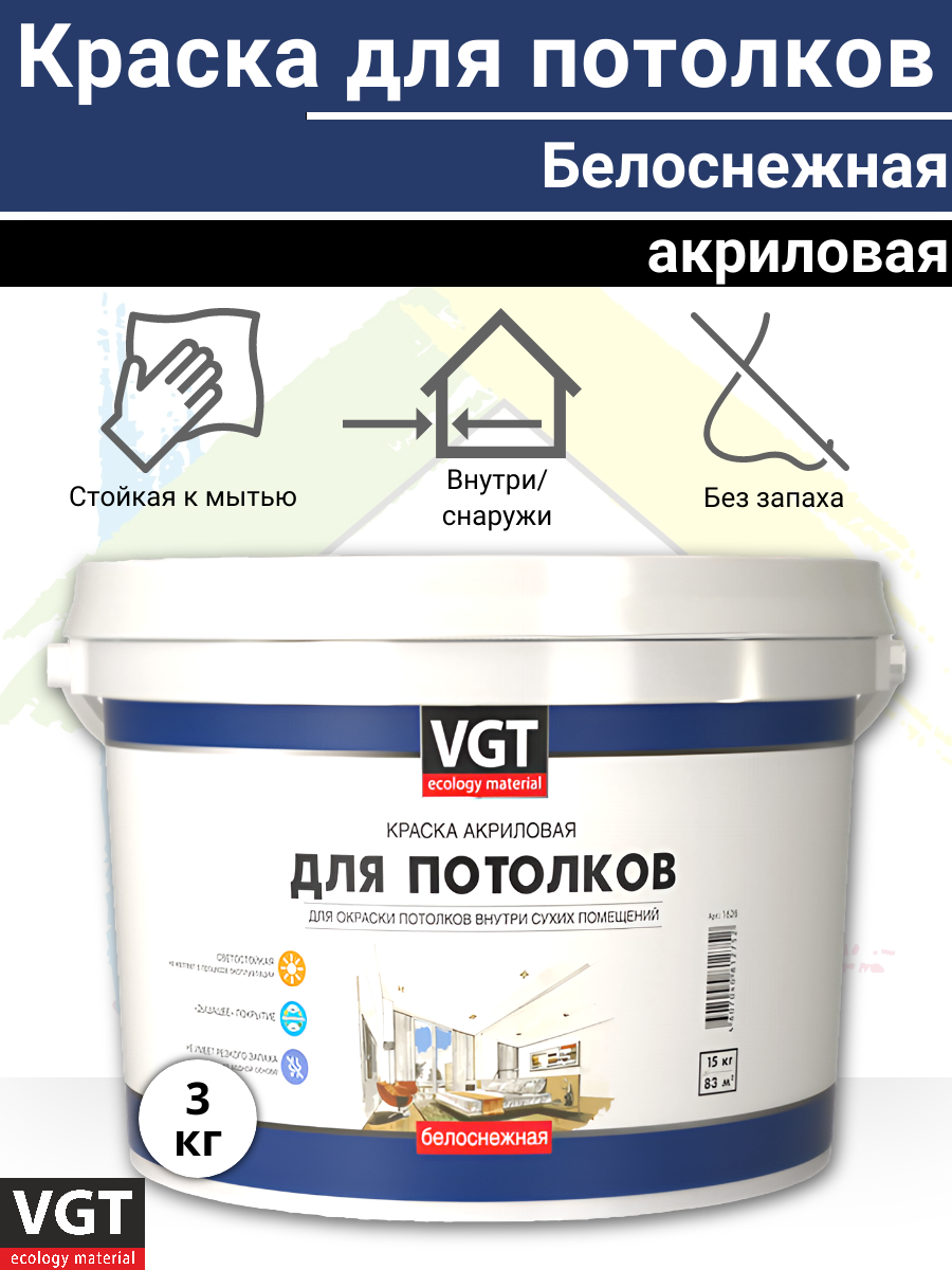 Ниже Вы можете прочитать отзывы на Краска для потолков VGT, краска акриловая Белоснежная, краска для внутренних работ 3 кг., ознакомится с подробными характеристиками, посмотреть интересные обзоры и фотографии на Краска для потолков VGT, краска акриловая Белоснежная, краска для внутренних работ 3 кг..