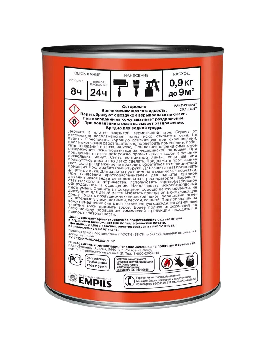 | Дополнительная информация | Для окрашивания деревянных, металлических, минеральных поверхностей снаружи и внутри помещений, кроме пола, также возможно нанесение на ранее окрашенные, в том числе алкидными материалами, поверхности. Может применяться для окрашивания цокольных этажей, крыш с минеральным и металлическим покрытием. Перед нанесением эмали на металл необходимо предварительное грунтование поверхности. Эмаль в соответствии с техническими и технологическими характеристиками рекомендуется к применению в детских комнатах, дошкольных, школьных, лечебно-профилактических учреждениях и предприятиях общественного питания. |