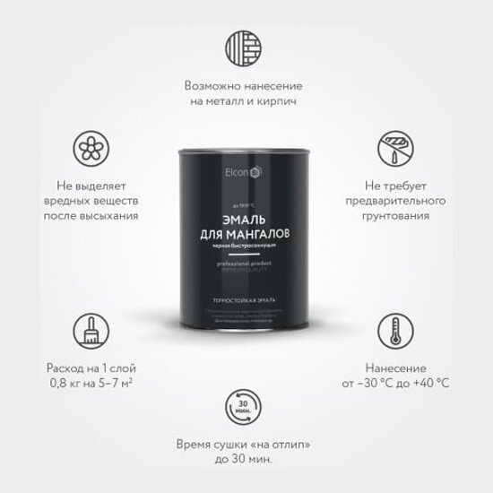 Термостойкая эмаль Elcon черная матовая, по металлу, кирпичу, бетону до 1000 °C, 0,4 л