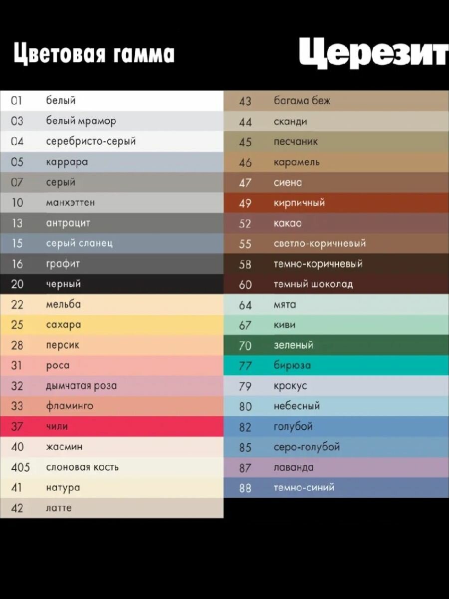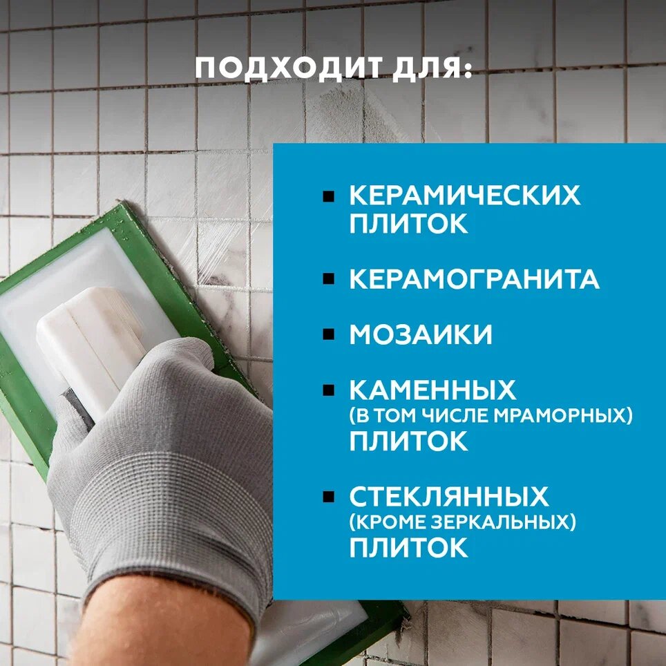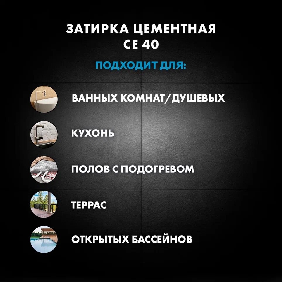 | Область применения | бассейны, для ванной комнаты, для внутренних работ, для затирки швов, для кухни, для наружных работ, для пола, для стен, для теплого пола, камины и печи, керамическая плитка, натуральный камень, террасы и балконы, фасад |