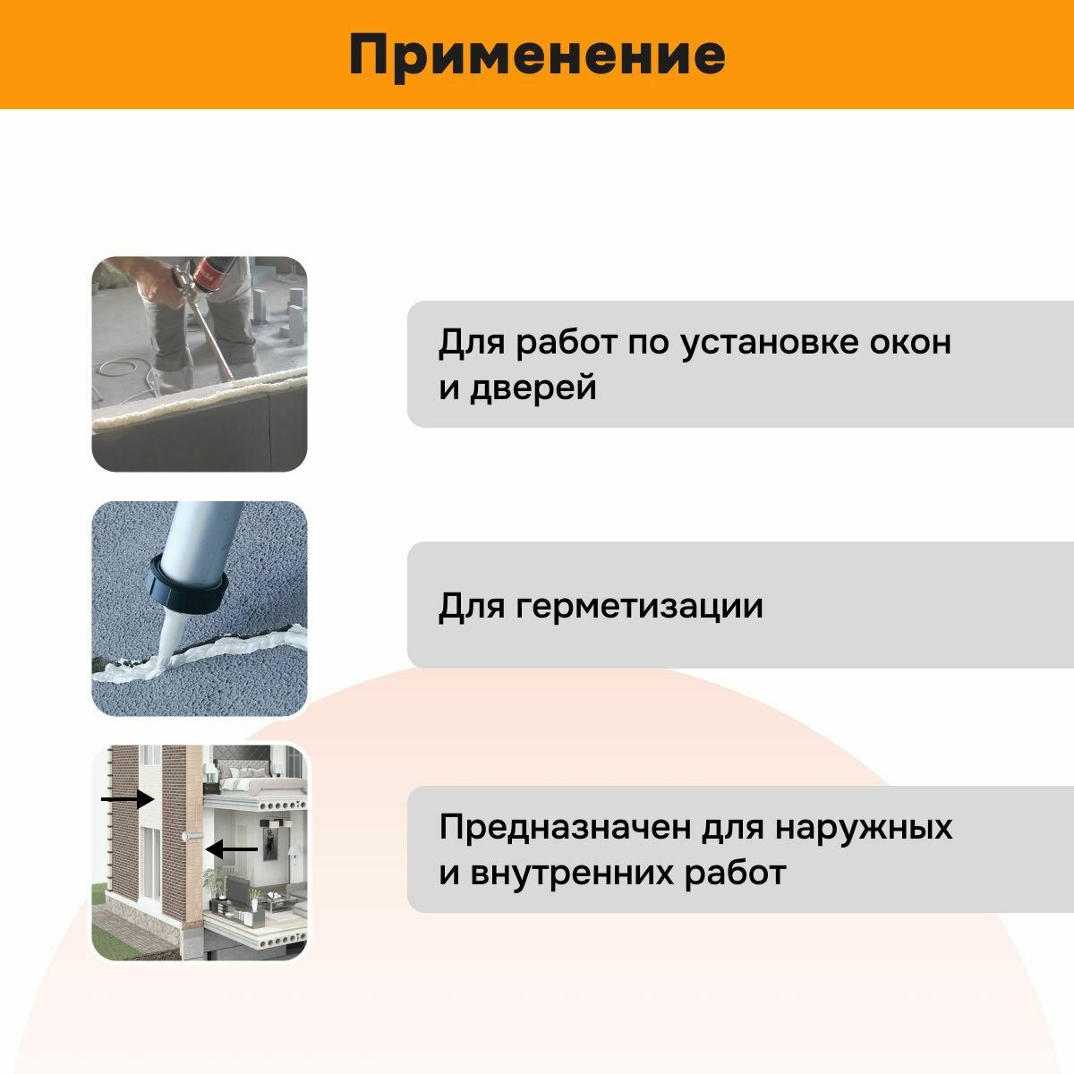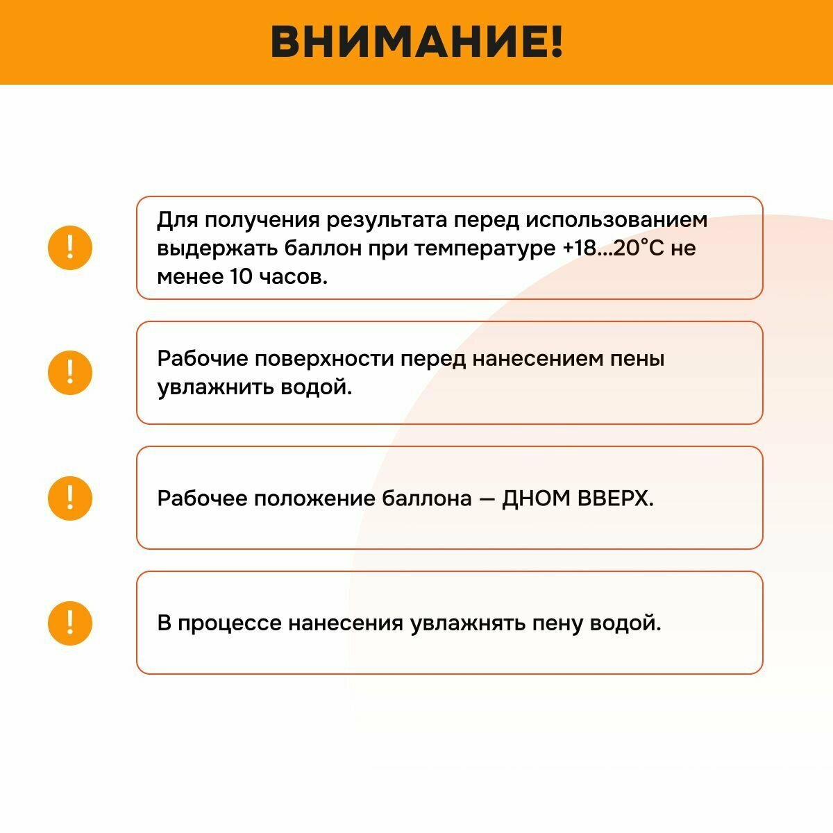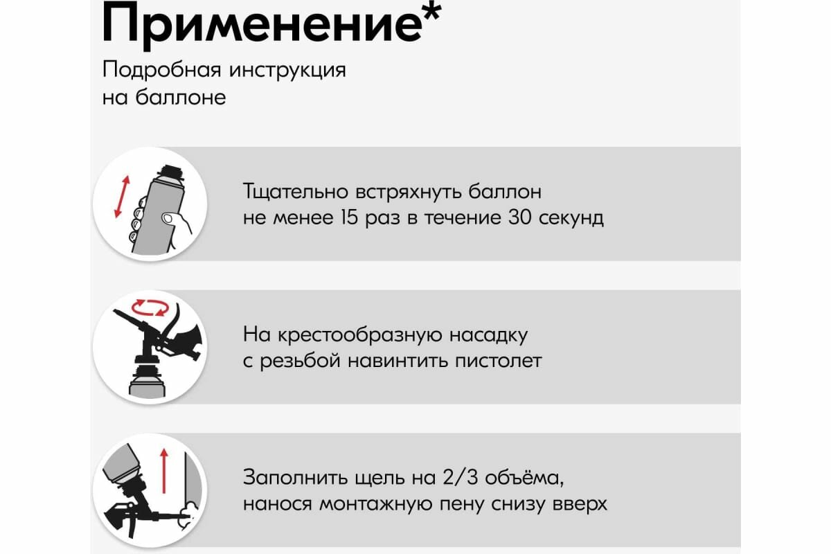 | Дополнительная информация | структура на срезе мелкопористая однородная, вторичное расширение 15–30% время образования поверхностной пленки до 10 минут, время первичной обработки до 20 минут, плотность 10-20 кг/м3, технология AFC® уникальная формула компонентов позволяет использовать баллоны летней пены, охлажденные до 0°С, клапан smart2lock предотвращает потери газа при хранении, обеспечивает высокую стойкость к залипанию клапана, допускает транспортировку баллона в горизонтальном положении, хранить в вертикальном положении клапаном вверх в сухом прохладном месте при температуре окружающей среды от +5°С до +25°С, состав 4,4-дифенилметандиизоцианат, диметиловый эфир, пропан-бутан, полиольный компонент |