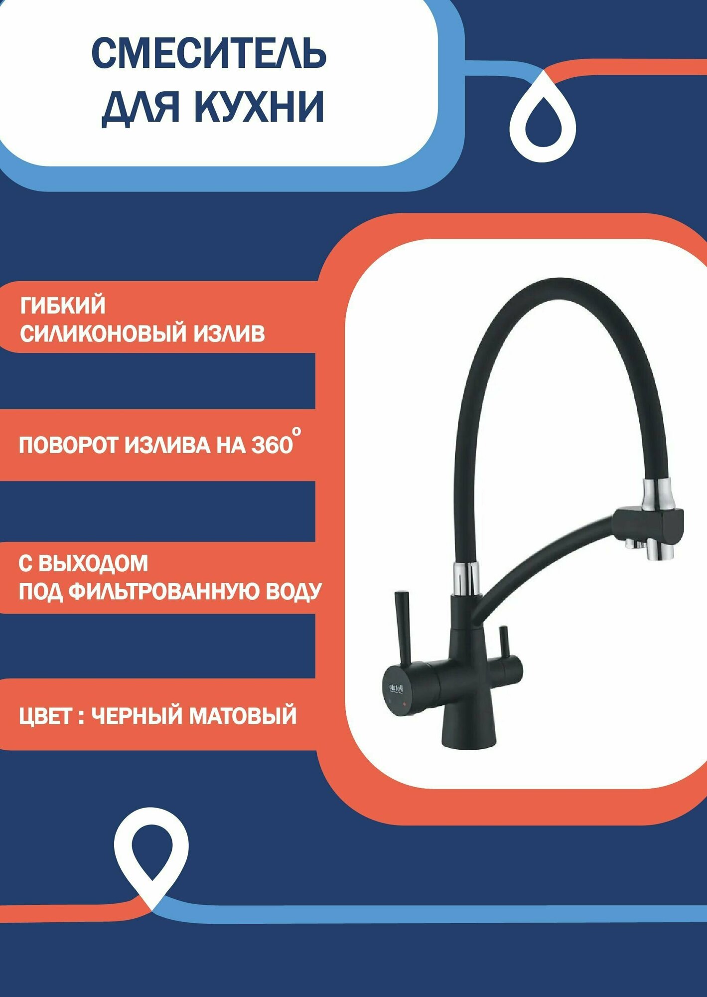 Смеситель на кухню Potato P4077BL с гибким изливом и краном для фильтрованной воды, чёрный, крепление гайка