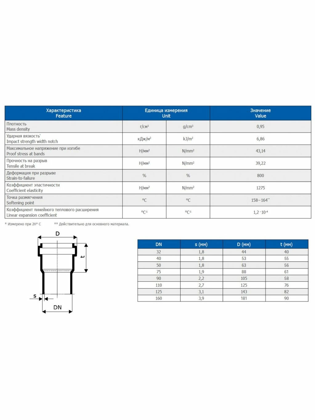 | Дополнительная информация | устойчивость к воздействию агрессивных сточных вод pH 2 - pH 12, огнестойкость по DIN 4102 класс B1; цвет RAL 7037; на трубах нанесена сантиметровая линейка для удобства монтажа; диаметр раструба 105 мм, длина раструба 58 мм |