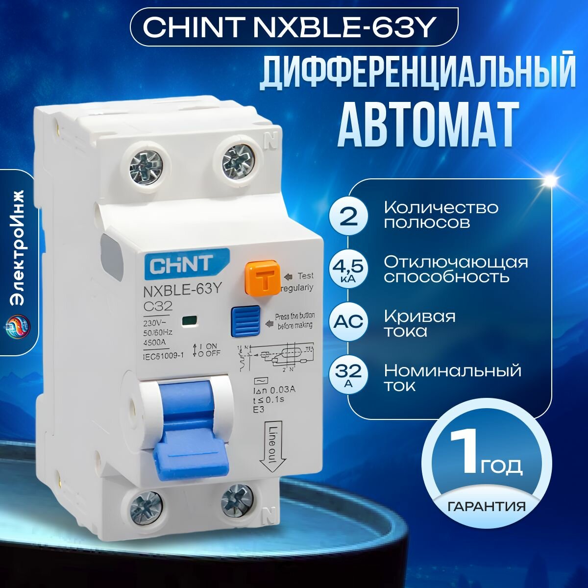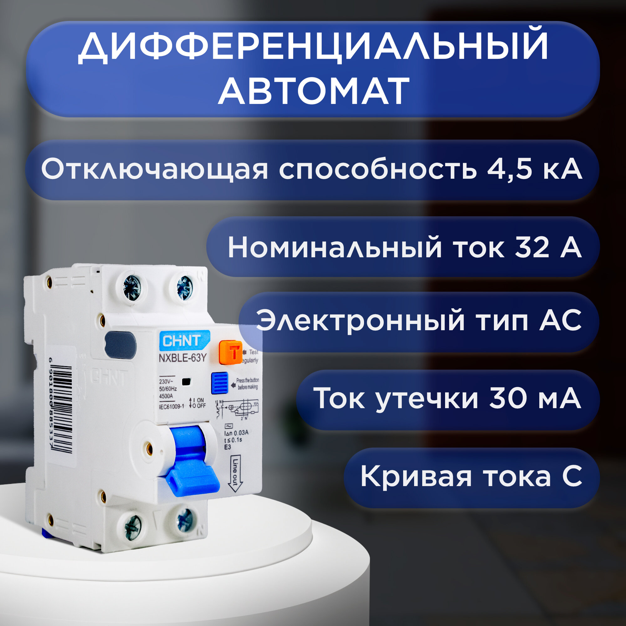 Выключатель автоматический дифференциального тока 1п+N C 32А 30мА электрон. тип AC 4.5кА NXBLE-63Y (R) | код 105545 | CHINT ( 1шт. )