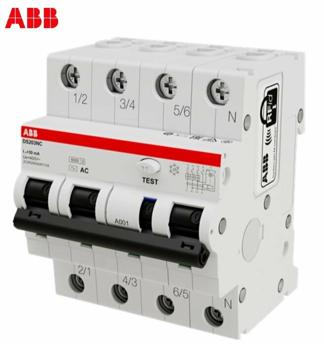 DS203NC C6 AC30 дифференциальный автоматический выключатель 3P+N, 6A, 30mA, тип AC, 6kA (хар-ка C) ABB, 2CSR256040R1064