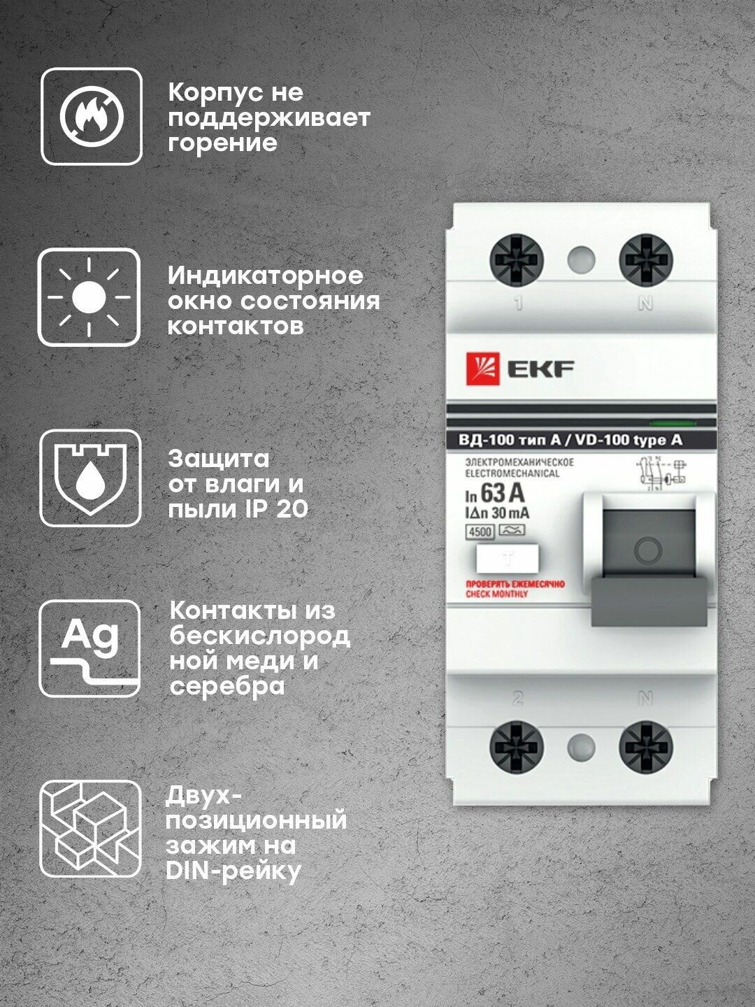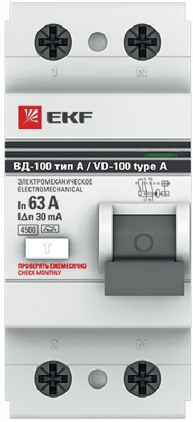 Купить Устройство Защитного Отключения ВД-100 2P 63А- 30мА (эл-мех, тип А) EKF PROxima.
