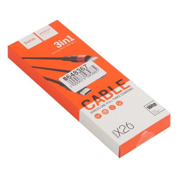 Купить Кабель USB HOCO X26 Xpress 3 в 1 для Lightning, Micro USB, Type-C, 2.0A, длина 1.0м, черный с красным