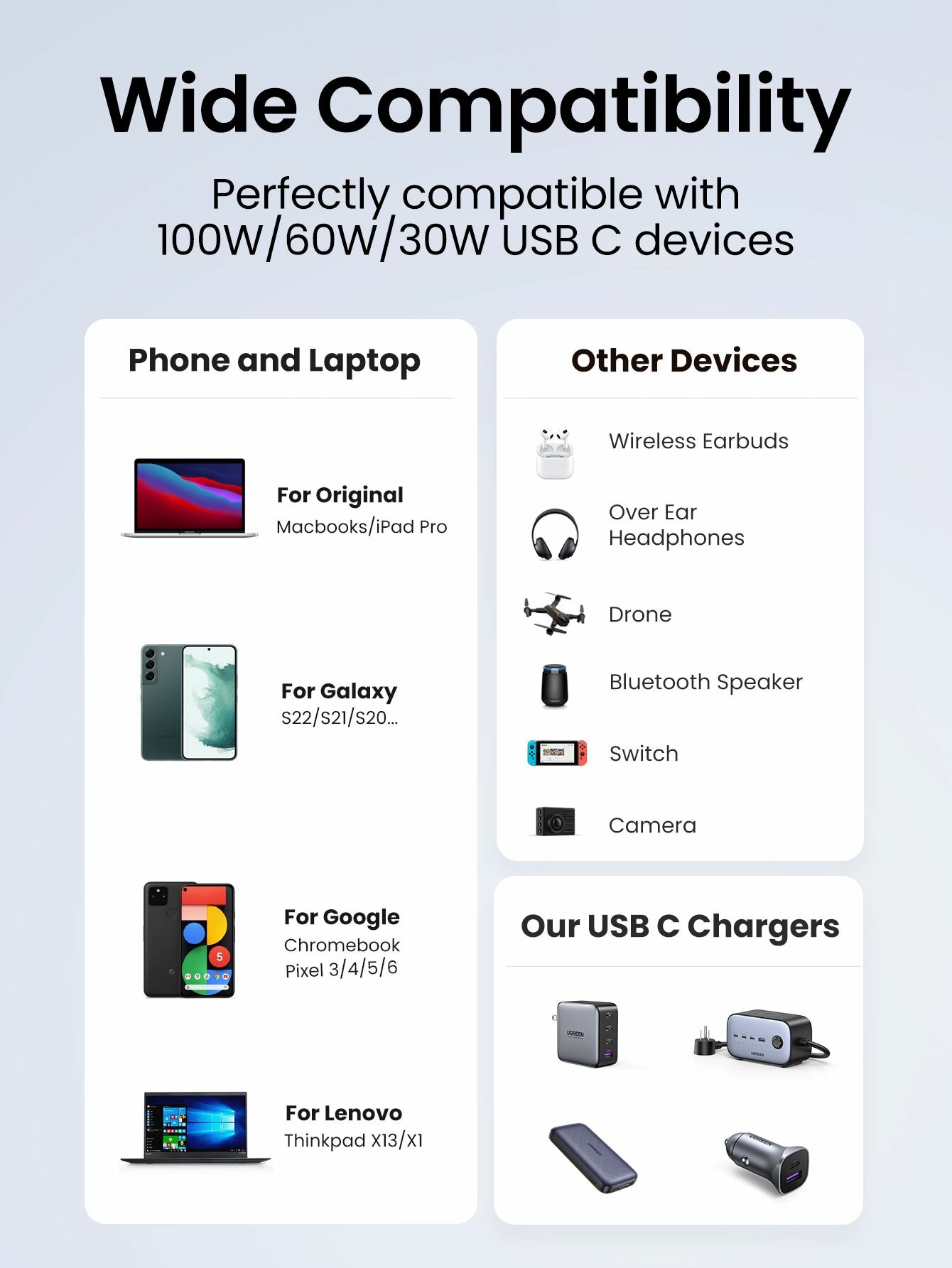 Type-C провод UGREEN 100W с быстрой зарядкой для iPhone 16, Xiaomi, Samsung, MacBook, iPad и тд. Кабель 1 метр