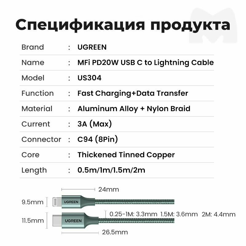 Ниже Вы можете прочитать отзывы на Кабель для быстрой зарядки и передачи данных UGREEN US304 / USB-C на Lightning / MFi сертификат / Длина 1м / цвет темно-зеленый (80564), ознакомится с подробными характеристиками, посмотреть интересные обзоры и фотографии на Кабель для быстрой зарядки и передачи данных UGREEN US304 / USB-C на Lightning / MFi сертификат / Длина 1м / цвет темно-зеленый (80564).