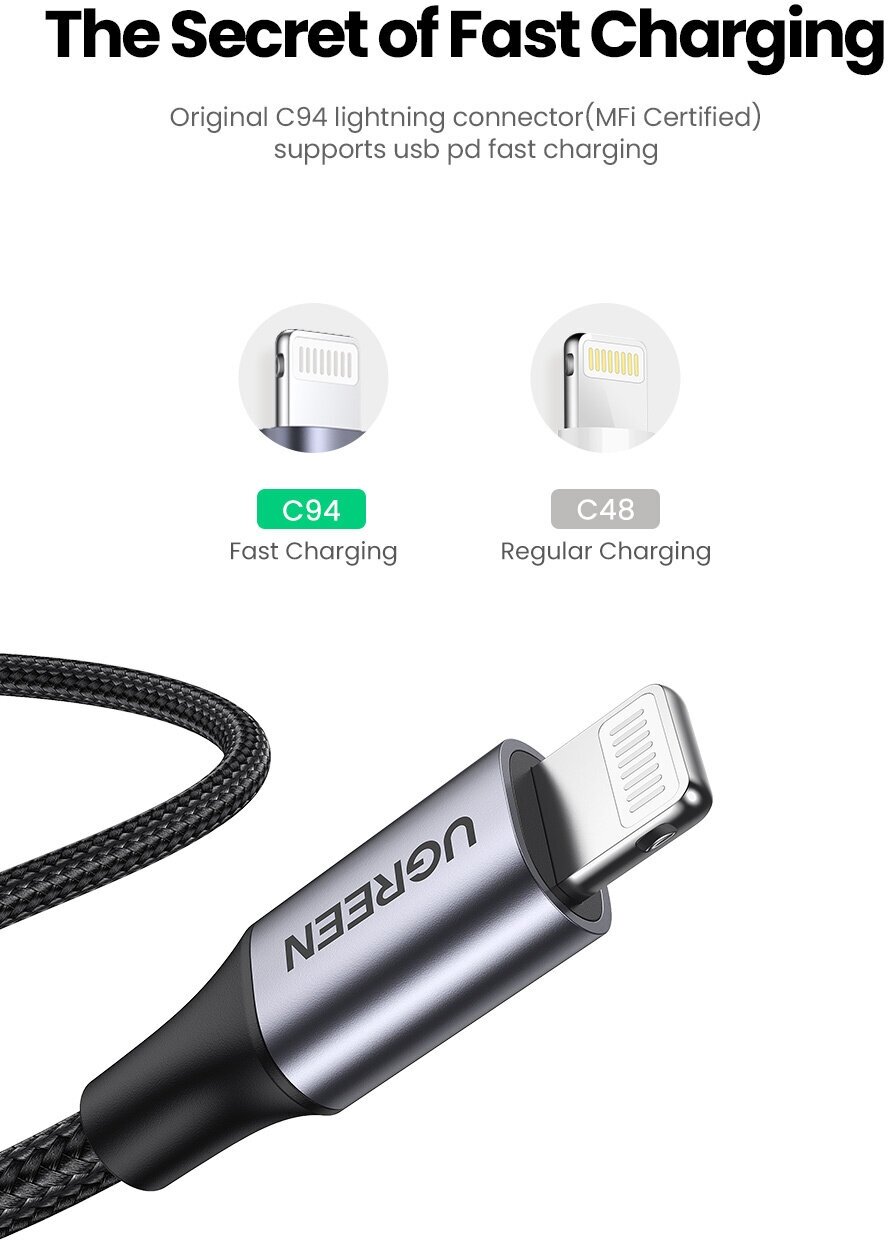 Купить Кабель UGREEN US304 (60759) USB-C to Lightning M/M Cable Aluminum Shell Braided. Длина 1 м. Цвет: черный