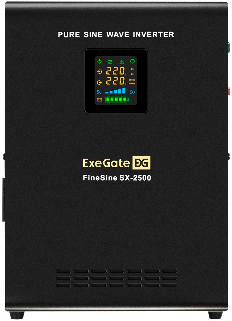 ИБП (инвертор, синус, для котла, настенный) ExeGate FineSine SX-2500.LCD.AVR.2SH <2500VA/1800W, чистая синусоида, цветной LCD-дисплей, AVR, 2*Schuko, линейно-интерактивный, внешняя батарея 24В до 200Ач (поставляется отдельно), Black> EX296002RUS