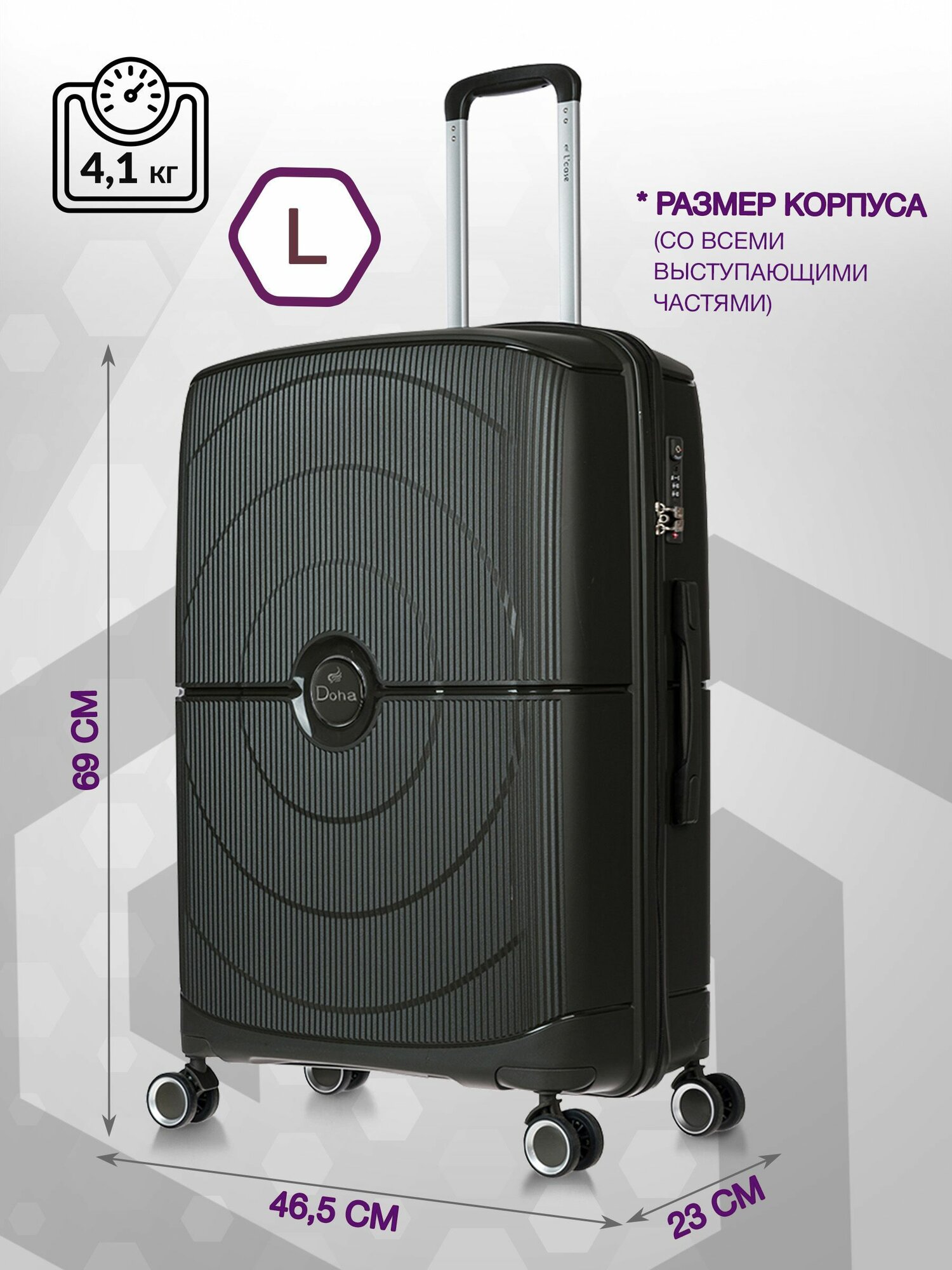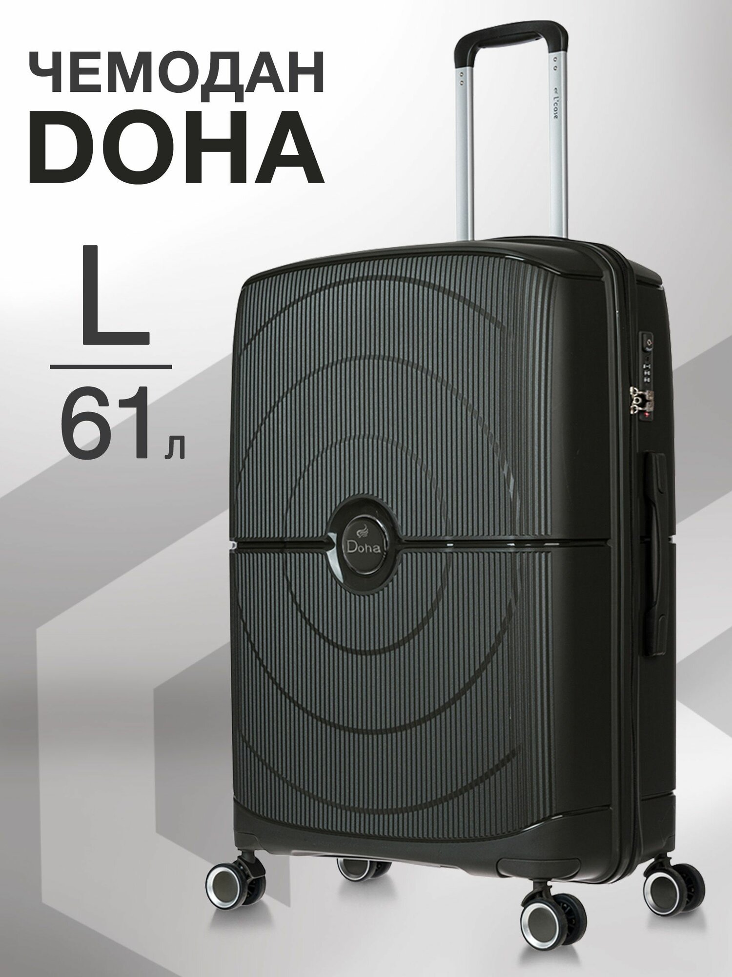 Купить Чемодан на колесах большой L полипропилен пластиковый Doha, семейный, дорожный, ударопрочный, кодовый замок, 69см, 61л