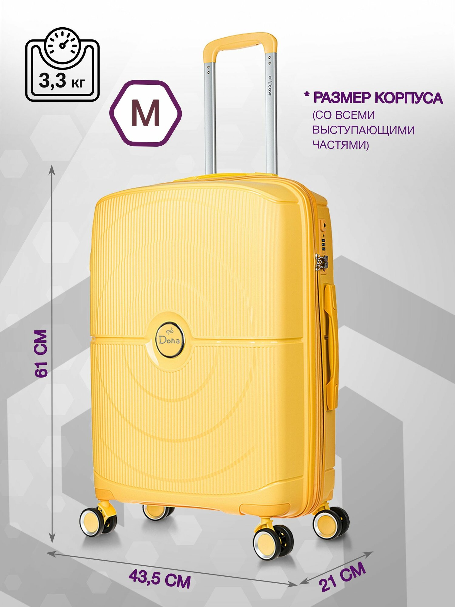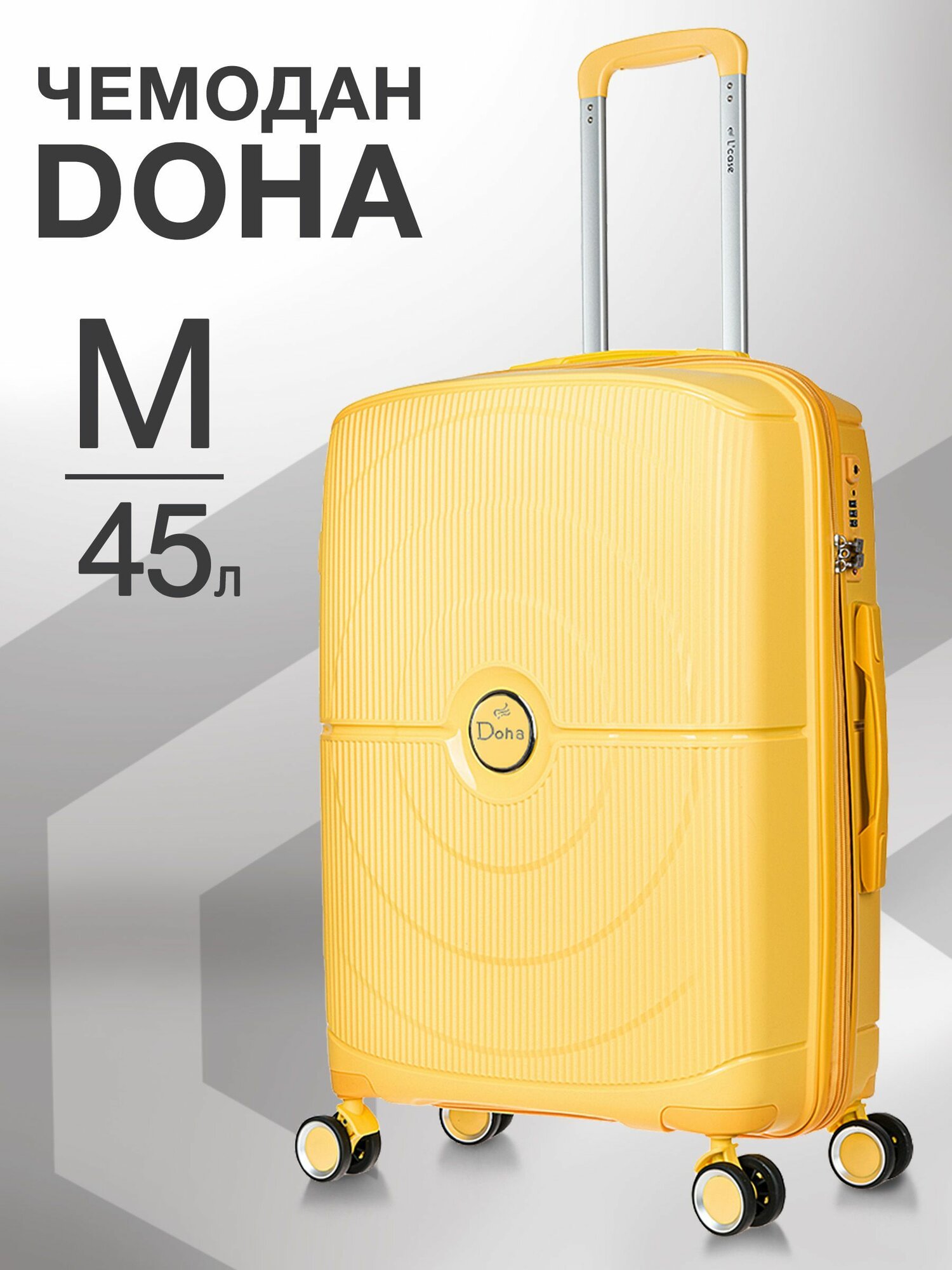 Купить Чемодан на колесах средний М полипропилен пластиковый Doha, дорожный, ударопрочный, кодовый замок, 61см, 45л