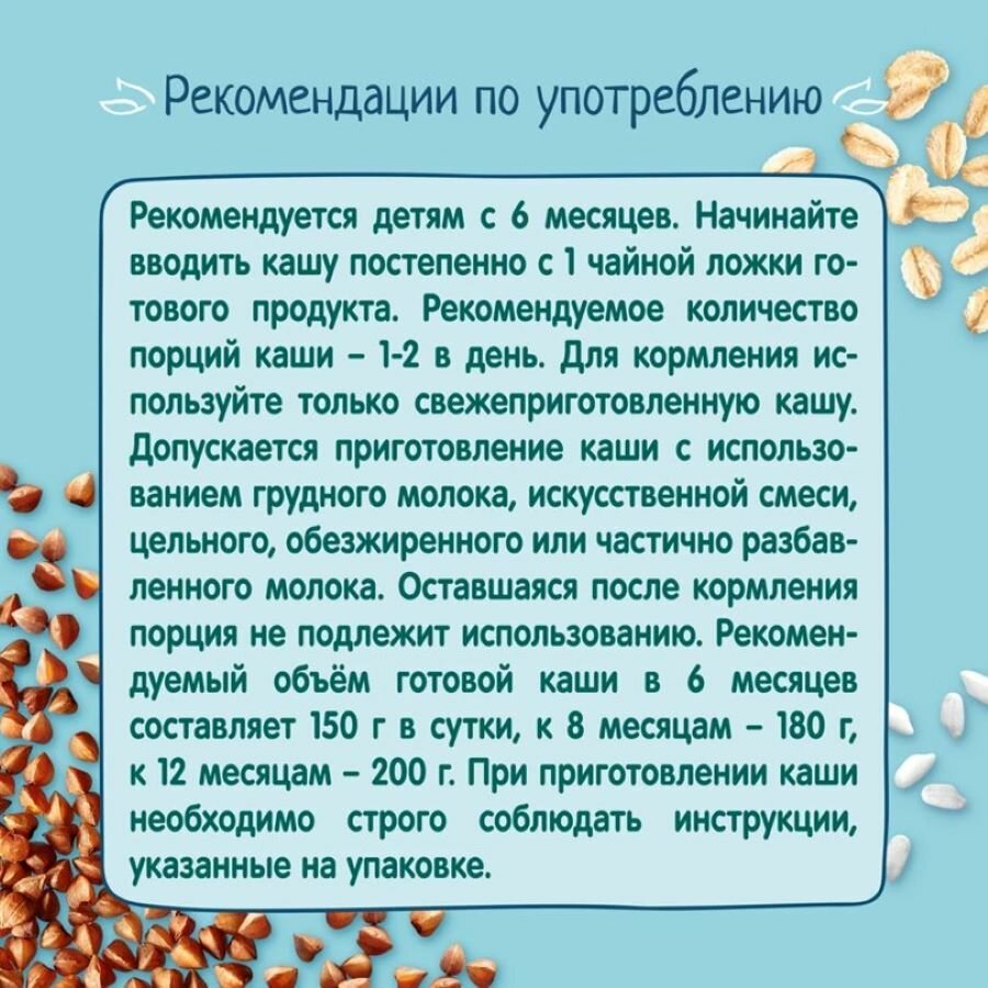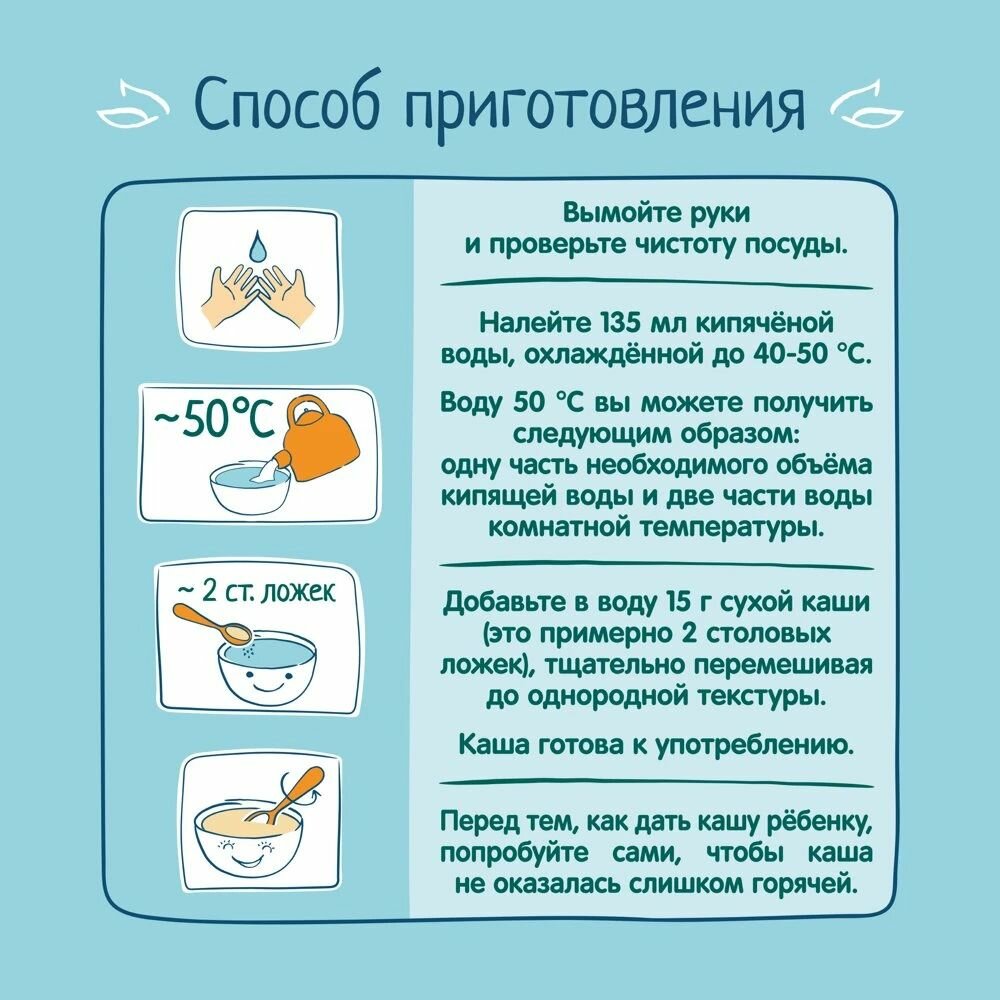 | Дополнительная информация | для приготовления готовой каши налейте в чистую посуду 135 мл кипячёной и охлажденной до 50°C воды; добавьте 15 г сухой каши, медленно высыпая и тщательно перемешивая до однородной консистенции; rаша готова к употреблению |
