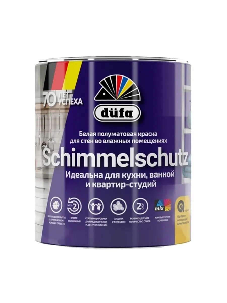 Дюфа Schimmelschutzfarbe база 1 белая краска влагостойкая полуматовая (0,9л) / DUFA Schimmelschutzfarbe base 1 краска влагостойкая для кухни ванной кв