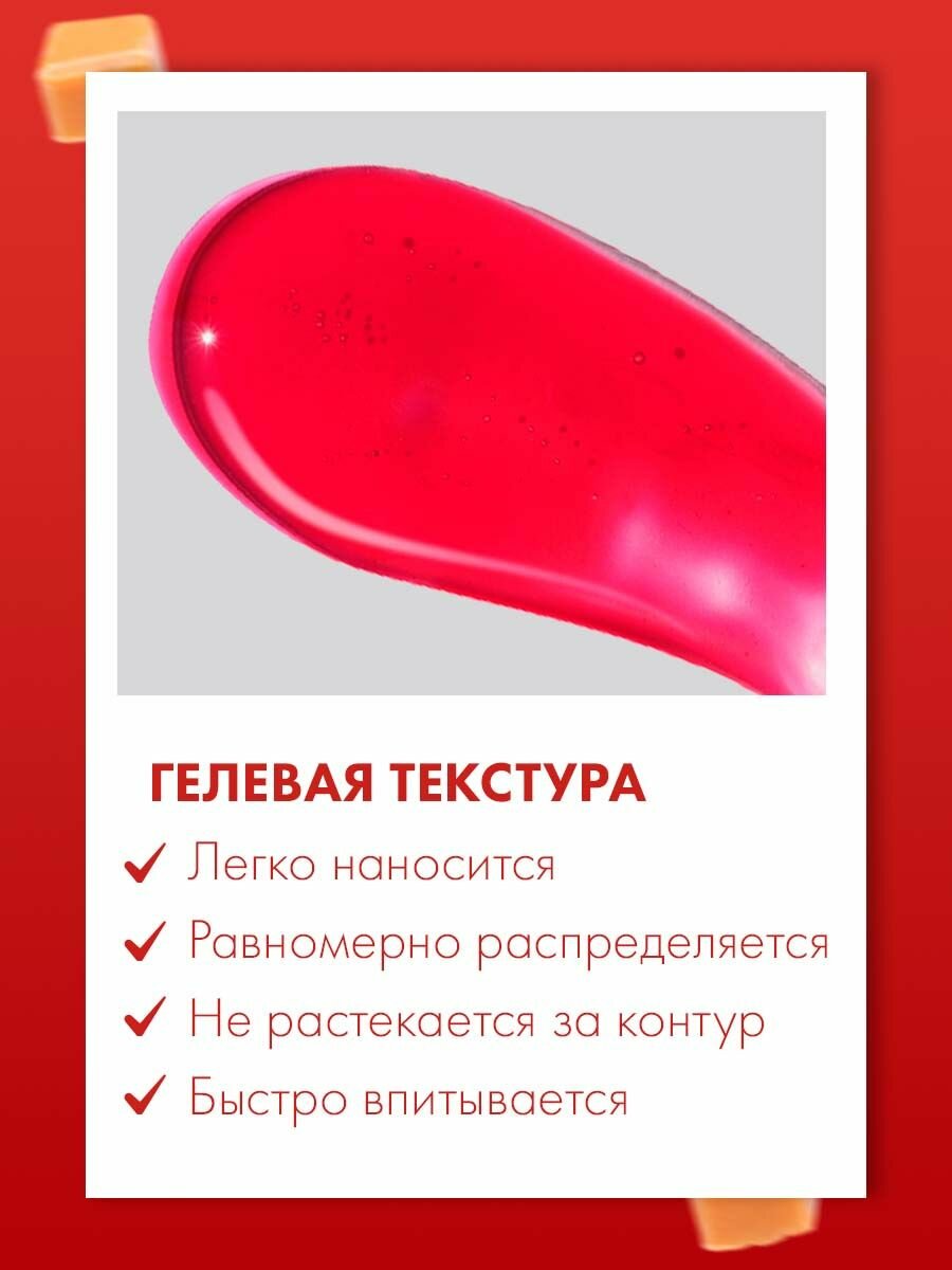 | Дополнительная информация | Тинт для губ на легкой водно-гелевой основе и повышенной концентрацией пигментов придает губам естественный оттенок и матовый финиш, усиливает выразительность и яркость природного цвета губ. Спустя несколько секунд после нанесения жидкая текстура высыхает и впитывается в кожу губ, превращаясь в невесомое полупрозрачное покрытие с эффектом "макияж без макияжа". Благодаря удобному аппликатору оттеночный гель-тинт для губ легко наносится и равномерно распределяется, не растекается за контур. |