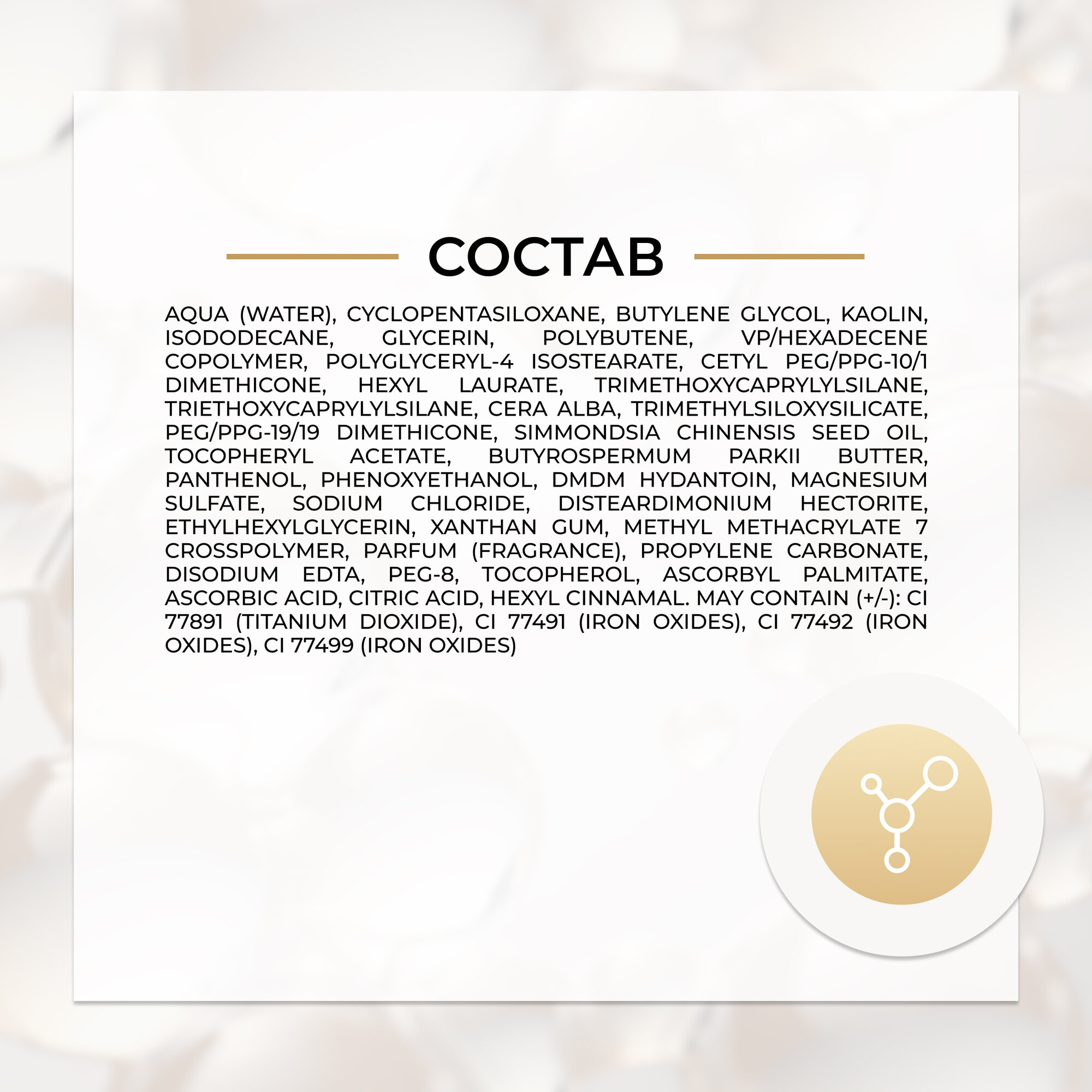 | Состав | aqua (water), cyclopentasiloxane, glycerin, caprylic/capric triglyceride, cetyl peg/ppg-10/1 dimethicone, isododecane, phenyl trimethicone, polybutene, polyglyceryl-4 isostearate, sodium chloride, cera alba, cera microcristallina, magnesium sulfate, peg/ppg-19/19 dimethicone, disteardimonium hectorite, microcrystalline cellulose, propylene carbonate, trimethylsiloxysilicate, tocopheryl acetate, propylene glycol, butyrospermum parkii butter, sodium hyaluronate, glycyrrhiza glabra root extract, kaolin, triethoxycaprylylsilane, aluminum hydroxide, alumina, magnesium oxide, tocopherol, phenoxyethanol, ethylhexylglycerin, citric acid, sodium benzoate, potassium sorbate, disodium edta, parfum (fragrance). (+/-) ci 77891 (titanium dioxide), ci 77491 (iron oxides), ci 77492 (iron oxides), ci 77499 (iron oxides) |