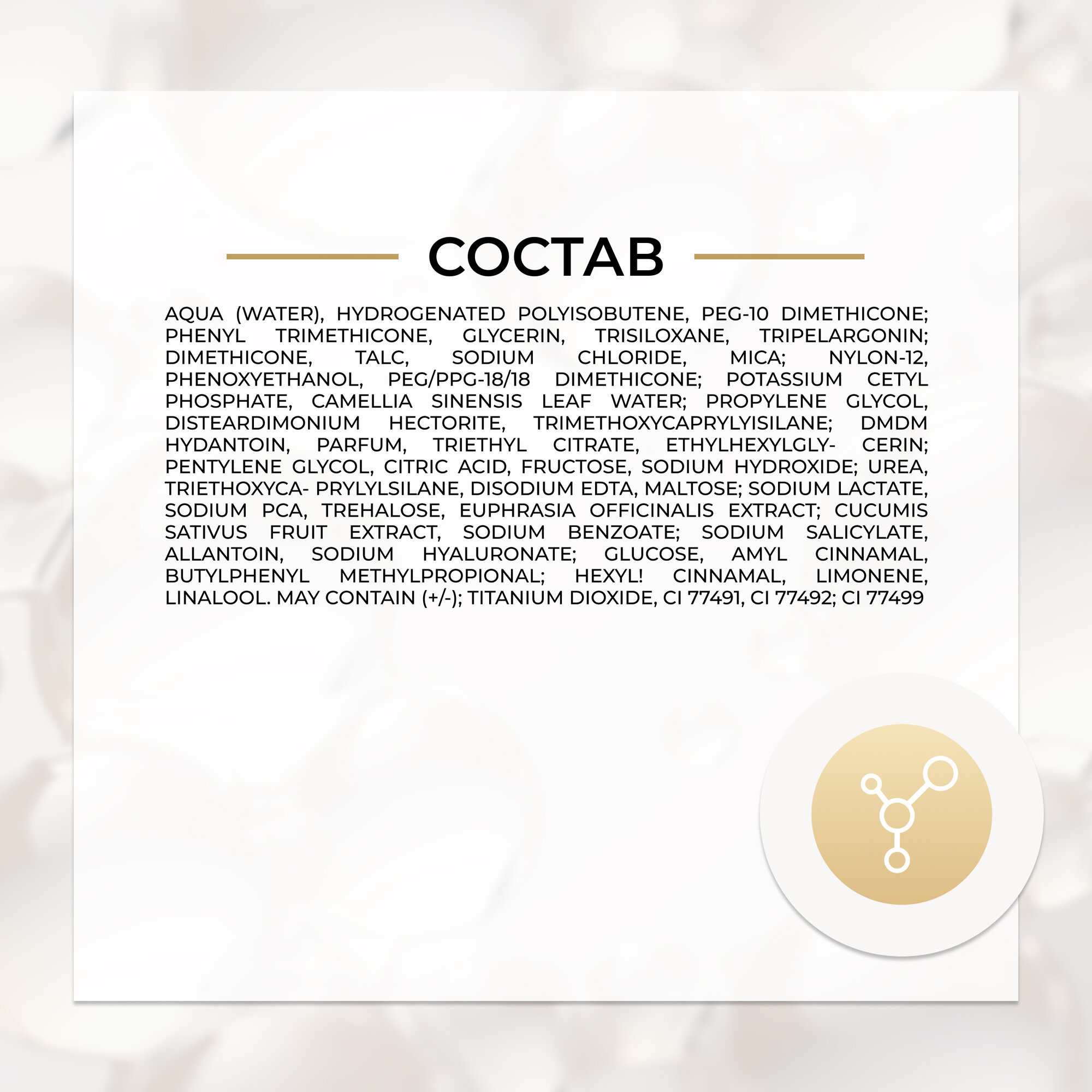 | Состав | aqua (water), hydrogenatedpolyisobutene, peg-10 dimethicone, phenyltrimethicone, glycerin, trisiloxane, tripelargonin, dimethicone, talc, sodiumchloride, mica, nylon-12, phenoxyethanol, peg/ppg-18/18 dimethicone, potassiumcetylphosphate, camelliasinensisleafwater, propyleneglycol, disteardimoniumhectorite, trimethoxycaprylylsilane, dmdmhydantoin, parfum, triethylcitrate, ethylhexylglycerin, pentyleneglycol, citricacid, fructose, sodiumhydroxide, urea, triethoxycaprylylsilane, disodiumedta, maltose, sodiumlactate, sodiumpca, trehalose, euphrasiaofficinalisextract, cucumissativusfruitextract, sodiumbenzoate, sodiumsalicylate, allantoin, sodiumhyaluronate , glucose, amylcinnamal, butylphenylmethylpropional, hexylcinnamal, limonene, linalool. may contain (+/-): titanium dioxide, ci 77491, ci 77492, ci 77499 |
