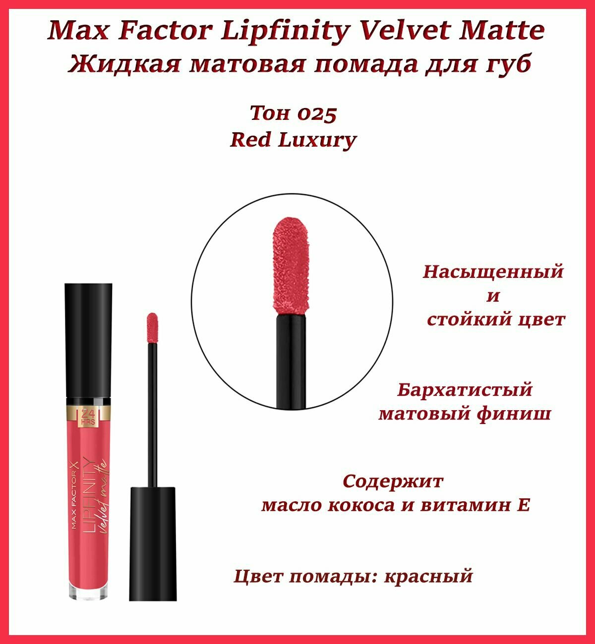 Купить MAX FACTOR Lipfinity Velvet matte помада жидкая 025 Red luxury 3,5мл