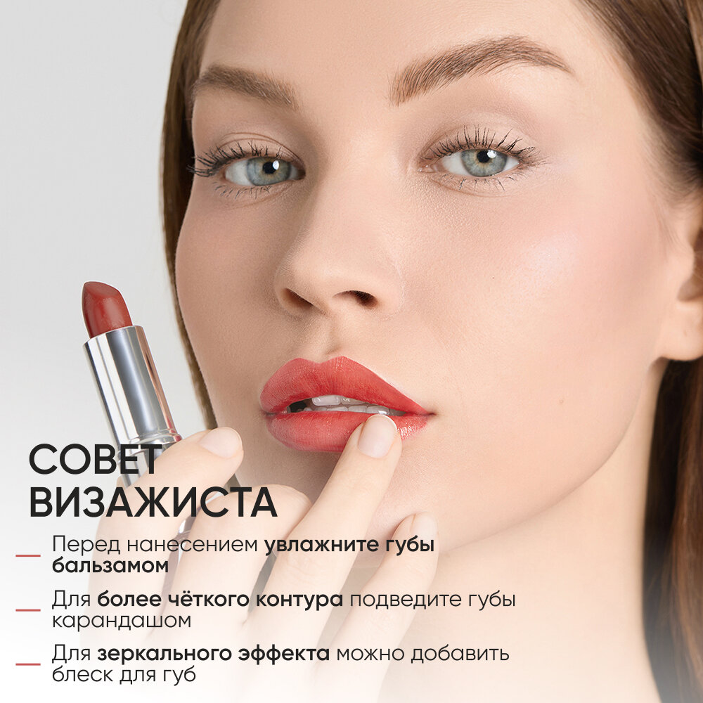 | Способ применения | Начните нанесение от центра верхней губы по дуге купидона, затем двигайтесь по направлению к уголкам и заполните центр губ. Для более четкого точного контура и интенсивного цвета используйте карандаш для губ. |