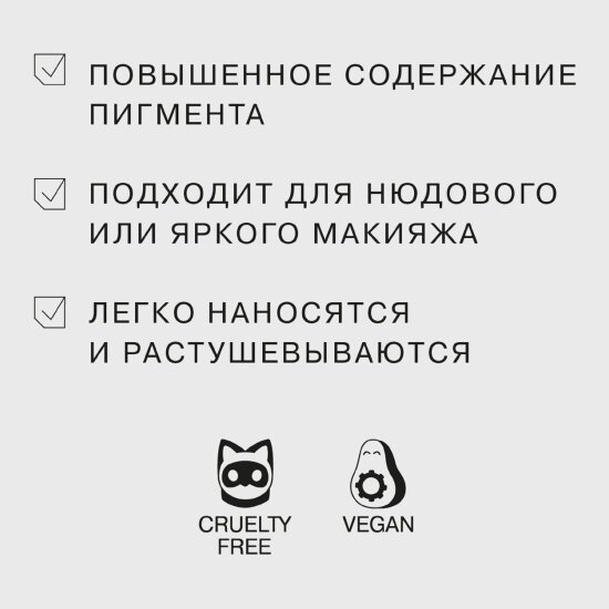 | Способ применения | Наносить кистью или подушечками пальцев. Используйте 2-3 цвета в макияже для более выразительного эффекта. |